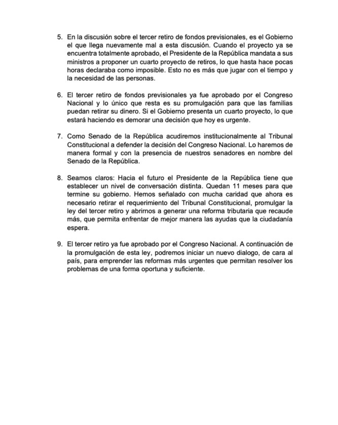 Tras una reunión este sábado, los senadores y senadoras de oposición e independientes instaron a Sebastián Piñera a promulgar el proyecto de ley que faculta a un tercer retiro de fondos previsionales y no jugar con el tiempo y la paciencia de las personas en la elaboración de un cuarto proyecto.