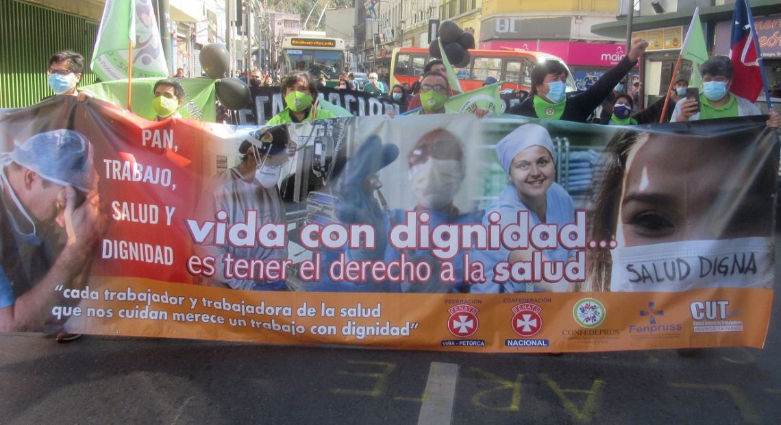 Con la Consigna “Pan, trabajo, Salud y Dignidad” diversas organizaciones sociales y sindicales de trabajadoras y trabajadores dieron el vamos el viernes en la mañana acá en Valparaíso a la Huelga Sanitaria convocada por la CUT con una marcha que se desplazó desde la Plaza Cívica hasta el Hospital Carlos Van Buren, recorriendo las principales calles del Puerto.