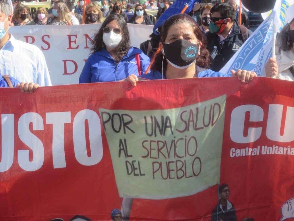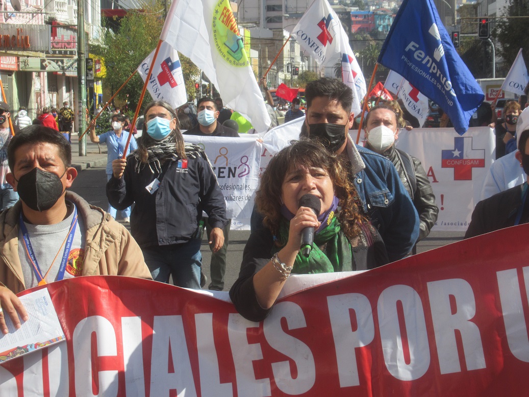 “Nuevamente nos tomamos la calle, se equivocó señor Piñera porque pensó que nos iba a callar, que nosotros solo íbamos a hacer nuestro trabajo acatando todas las indignas condiciones, pero esta lucha no es por dinero, es por dignidad, dignidad para todos los trabajadores, los trabajadores de los hospitales, los profesores, las trabajadoras y trabajadores, a todos quienes han estado desde el día uno de esta pandemia entregándose por enteros para atender de la mejor manera a los usuarios, a pesar de la precarización de la salud(…) Todos los trabajadores del sector público estamos acá dando la lucha y no vamos a entregar la calle y esta marcha se está haciendo a nivel nacional. Señor Piñera, los trabajadores nos tomamos nuevamente las calles para decirle que los trabajadores estamos unidos ahora más que nunca…”