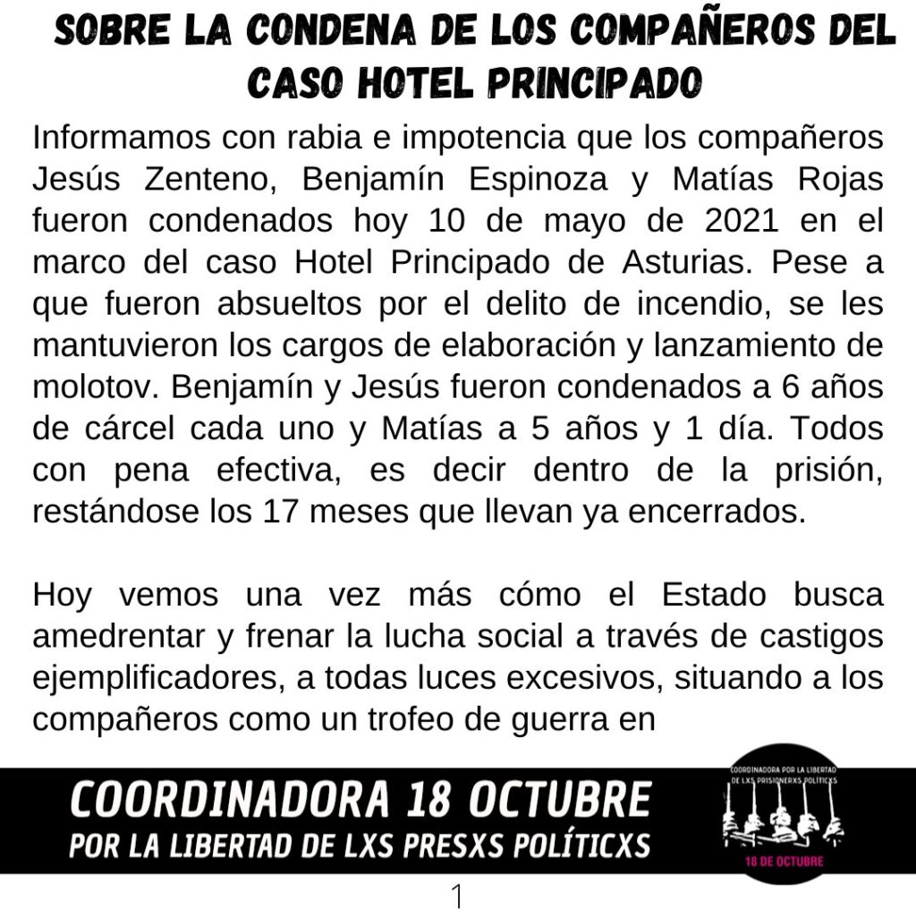 Sin embargo, el tribunal decretó la absolución de Espinoza Gatica, Rojas Marambio y Zenteno Guíñez de los cargos formulados en su contra, que los sindicaban como autores del delito de incendio, que afectó al Apart Hotel Principado de Asturias y, en el caso de Espinoza Gatica, del siniestro de maquinarias en faena de construcción aledaña, correspondiente a la Universidad de Chile.
