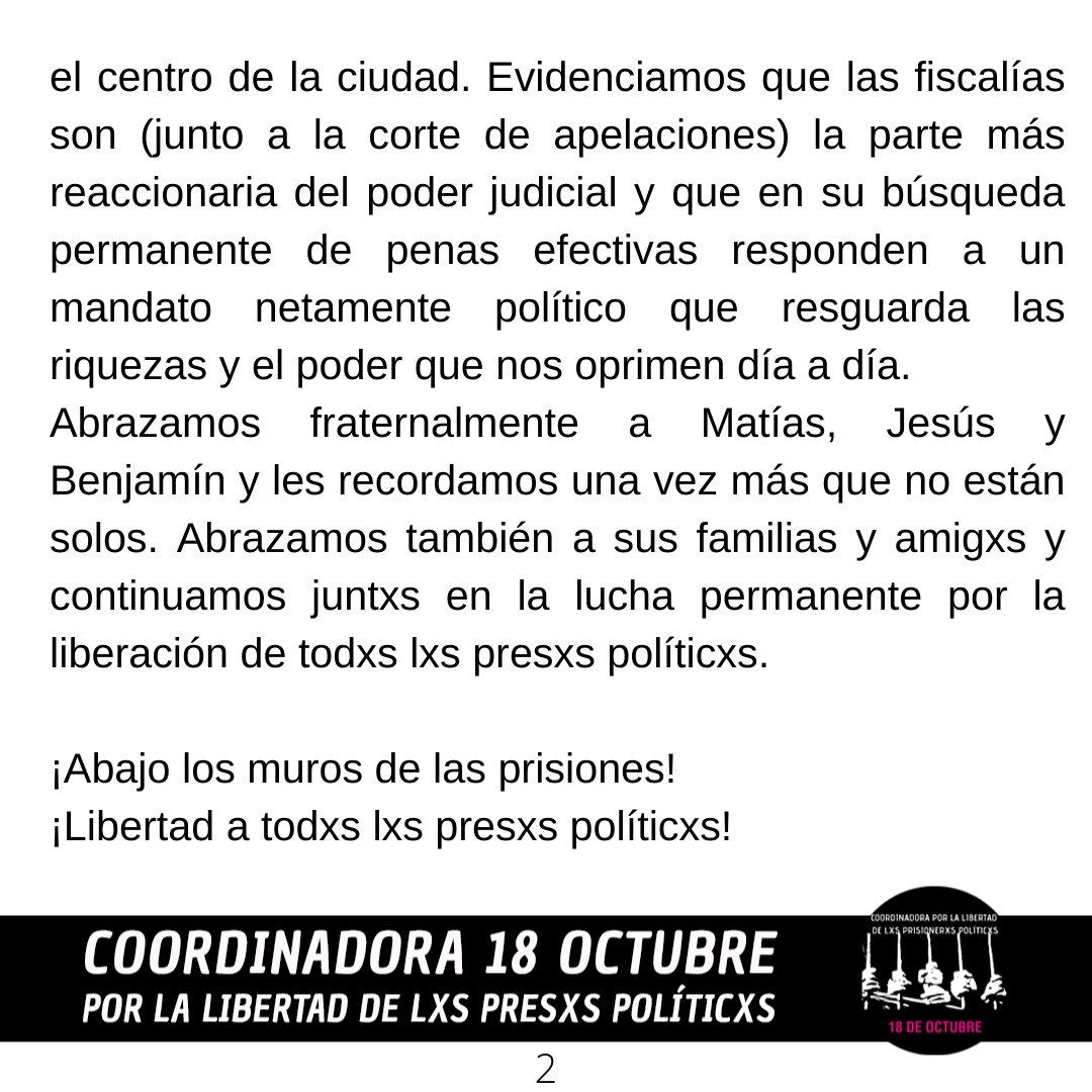 El Tercer Tribunal de Juicio Oral en lo Penal de Santiago condenó a Benjamín Alexis Espinoza Gatica y Jesús Alejandro Yietro Zenteno Guíñez a 6 años de presidio efectivo, en calidad de autores de los delitos reiterados de fabricación y lanzamiento de artefactos incendiarios; en tanto, Matías Elías Rojas Marambio deberá purgar 5 años y un día de presidio, como autor de tres delitos de elaboración de artefactos incendiarios.