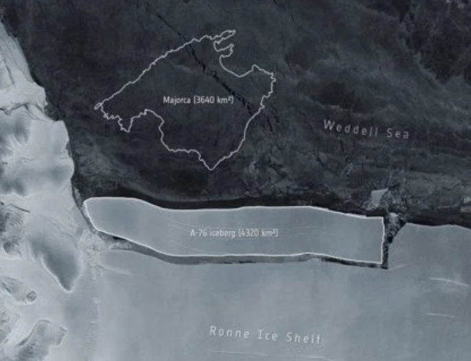 El iceberg, que fue denominado A-76, tiene una longitud de unos 170 kilómetros y una anchura de 25, con una superficie total de 4.320 kilómetros, frente a los 3.640 de Mallorca, señaló la Agencia Espacial Europea (ESA) para dar una idea de la magnitud del pedazo de hielo.