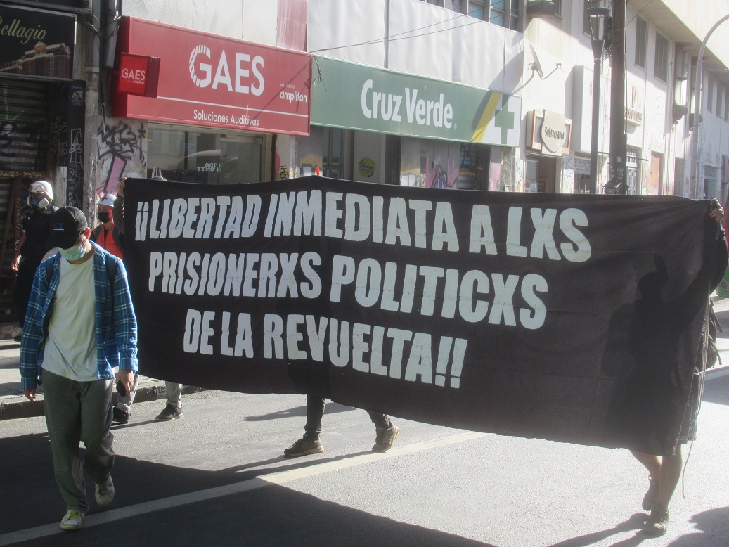 La demanda central levantada en esta movilización fue exigir la libertad de todas y todos los presos políticos de la revuelta, y los numerosos lienzos, pancartas y volantes lanzados al aire así lo explicitaban.