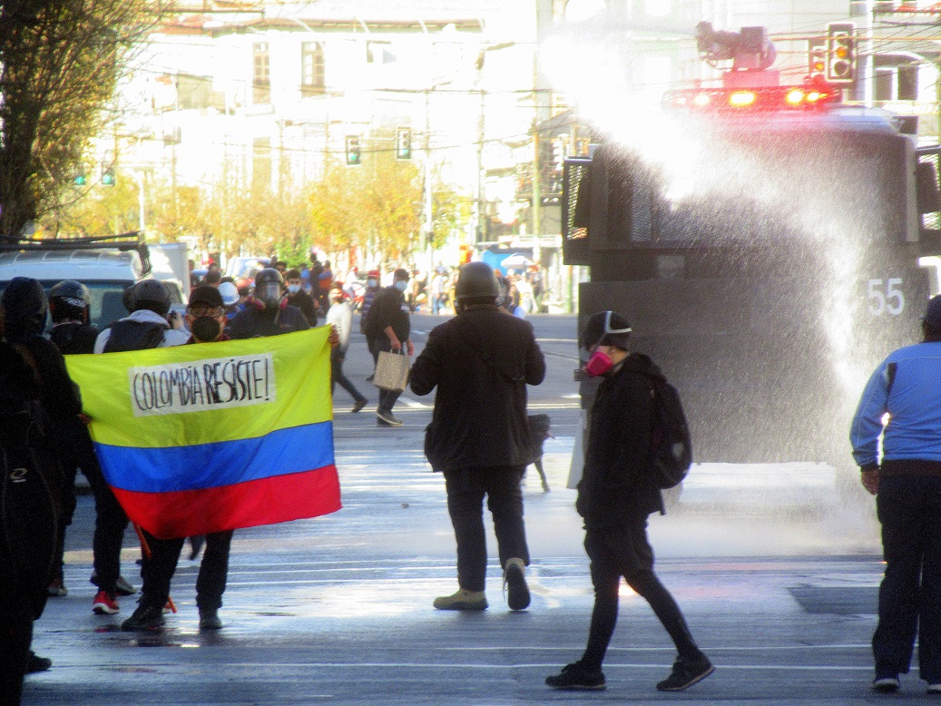 Esta vez no hubo banderas mapuche, pero si se pudo observar una bandera colombiana con la frase “Resiste Colombia”, como un homenaje a la lucha que llevan adelante las hermanas colombianas y los hermanos colombianos, ya que su lucha por la libertad y la justicia es la lucha de toda Latinoamérica.