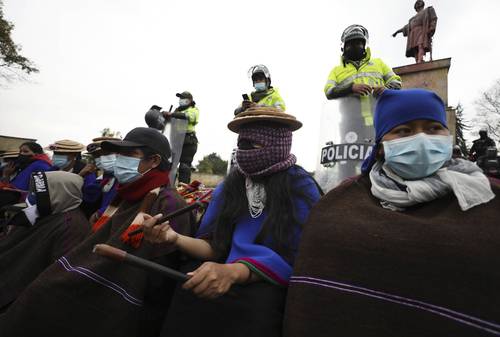 Un grupo de la etnia misak intentó derribar con cuerdas las estatuas de Cristóbal Colón y la reina Isabel la Católica sobre la avenida El Dorado, que conduce hacia el aeropuerto internacional capitalino. En el portal de Las Américas, en el sur de la ciudad, se reportaron enfrentamientos entre manifestantes y policías.