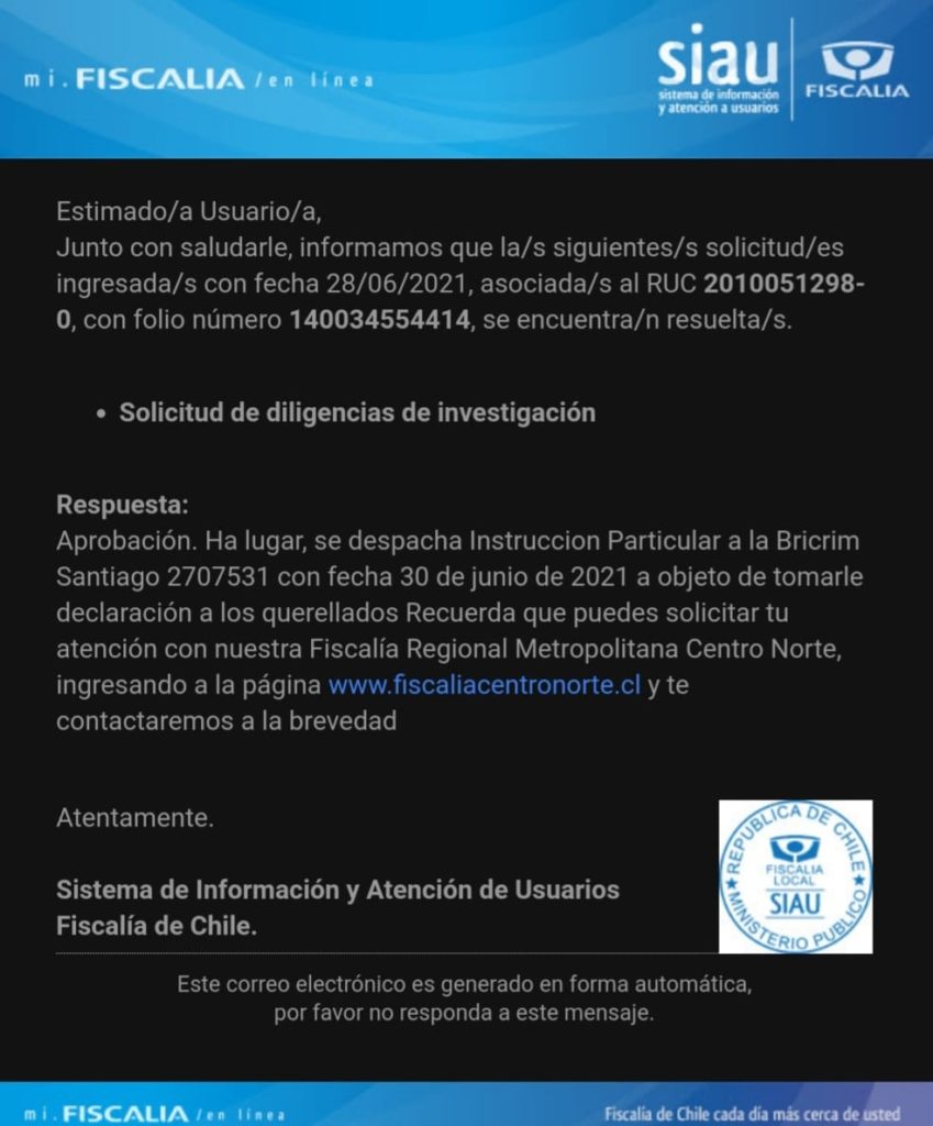 Rendón expresó su conformidad con la resolución del fiscal al acoger la diligencia solicitada y señaló que «esta causa deja de manifiesto la profunda politización de las fuerzas armadas y policías chilenas».