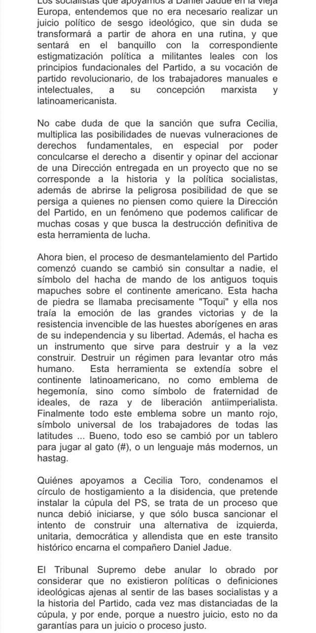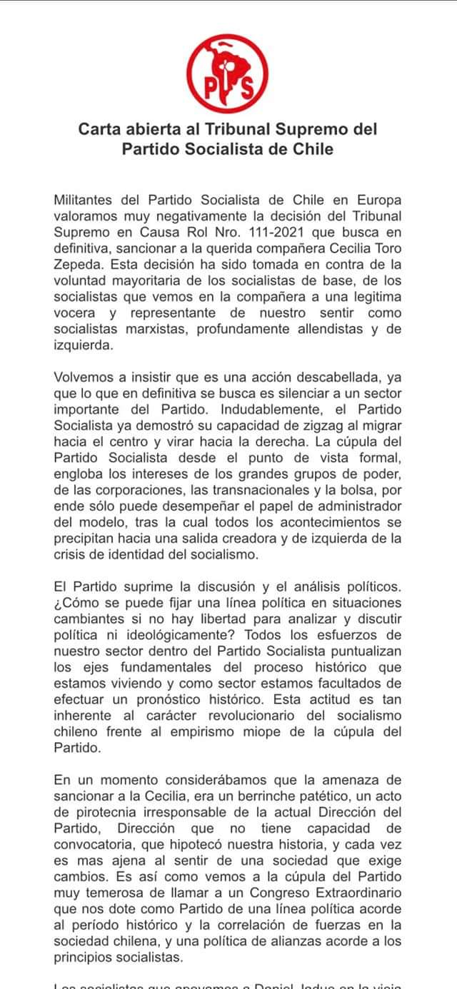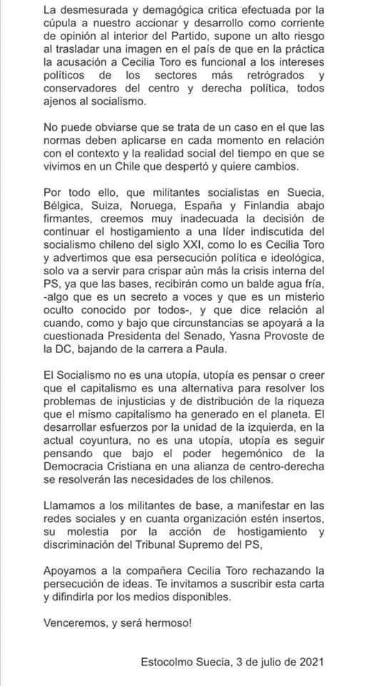 Militantes del Partido Socialista (PS) en el exterior suscribieron una carta abierta dirigida al tribunal Supremo del partido y a su dirigencia para repudiar la sanción contra la militante Cecilia Toro. La sanción tiene su origen en el apoyo de la militante a la candidatura de Daniel Jadue.