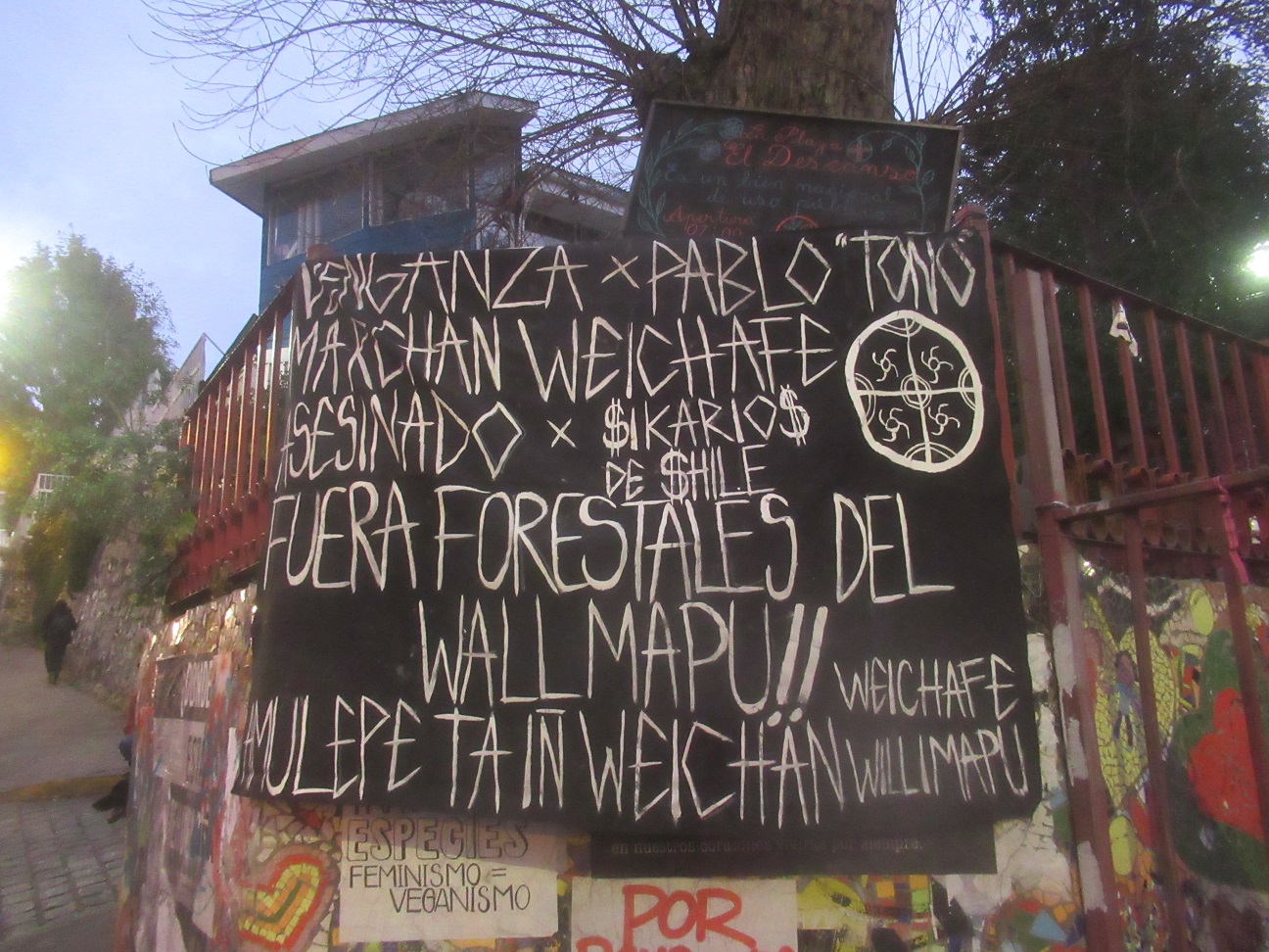 En horas de la tarde del lunes un grupo de manifestantes autoconvocados realizaron una acción de protesta popular en el sector de la Plaza del Descanso, ubicada en la combativa subida Cummings de Valparaíso, para rendir homenaje al weichafe Pablo Marchant, integrante de los ORT de la CAM, y al mismo tiempo para exigir el esclarecimiento de su muerte, ya que como planteó Héctor Llaitul en entrevista con Radio Universidad de Chile ayer domingo 11 de julio: “ Cuando ocurren hechos de esta naturaleza existen dos versiones siempre; la versión de Carabineros y la versión nuestra, de los mapuche, que no tiene mucha cabida en los medios de comunicación, porque la mayoría de los medios de comunicación son caja de resonancia del poder, es decir están financiados, están cooptados por los grupos económicos que están detrás de este conflicto, por lo tanto es muy poco lo que nosotros podíamos decir con argumentos.