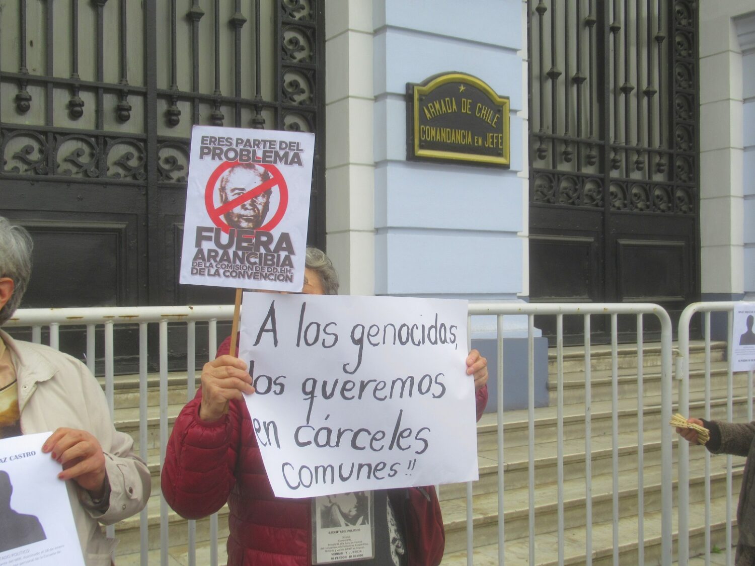Respecto al nombramiento de Jorge Arancibia en la Comisión de Derechos Humanos, manifestaron que “este es un hecho que nos llena de agravio y de vergüenza, porque se trata de un tipo que ha estado siempre negando la existencia de las violaciones sistemáticas a los derechos humanos ocurridas durante la dictadura, atentando contra uno de los principios fundamentales que debe ser plasmado en la nueva Constitución y que tiene que ver con la garantía de no repetición de estos brutales y repudiables acontecimientos. Por eso es inadmisible y oprobioso para todas las víctimas y sus familiares que haya sido integrado a dicha Comisión. Esta acción de denuncia la hacemos por la memoria de todos quienes fueron torturados, asesinados y hechos desaparecer.”