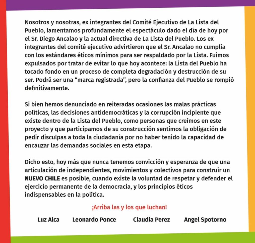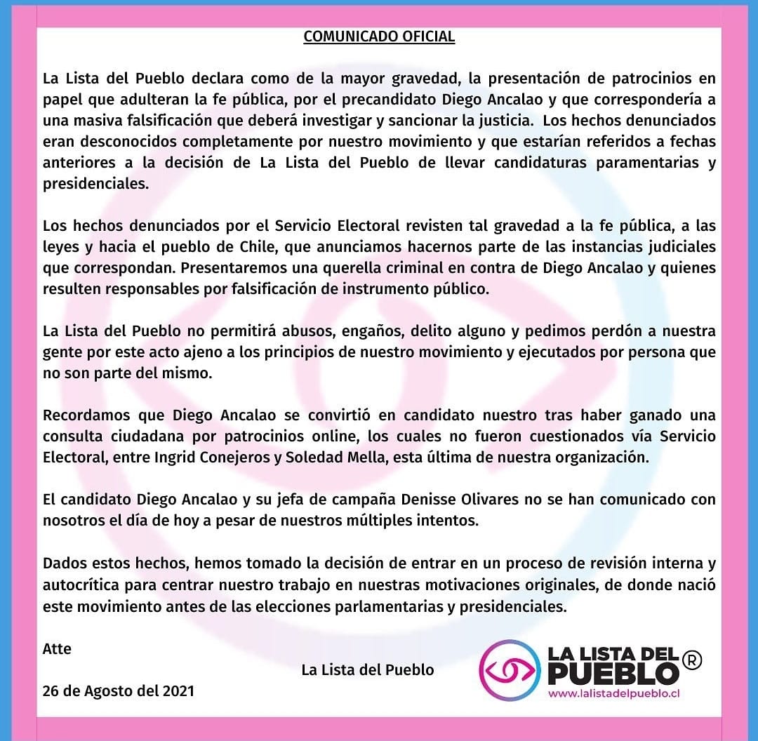La Lista el Pueblo anunció ayer que entrará en un periodo de revisión y autocrítica tras la falsificación de documentos realizada por el precandidato Diego Ancalao ante el Servel. Los hechos denunciados por el Servicio Electoral revisten tal gravedad hacia las leyes y hacia la fe pública, por lo que anuncian hacerse parte ante las instancias judiciales que correspondan.