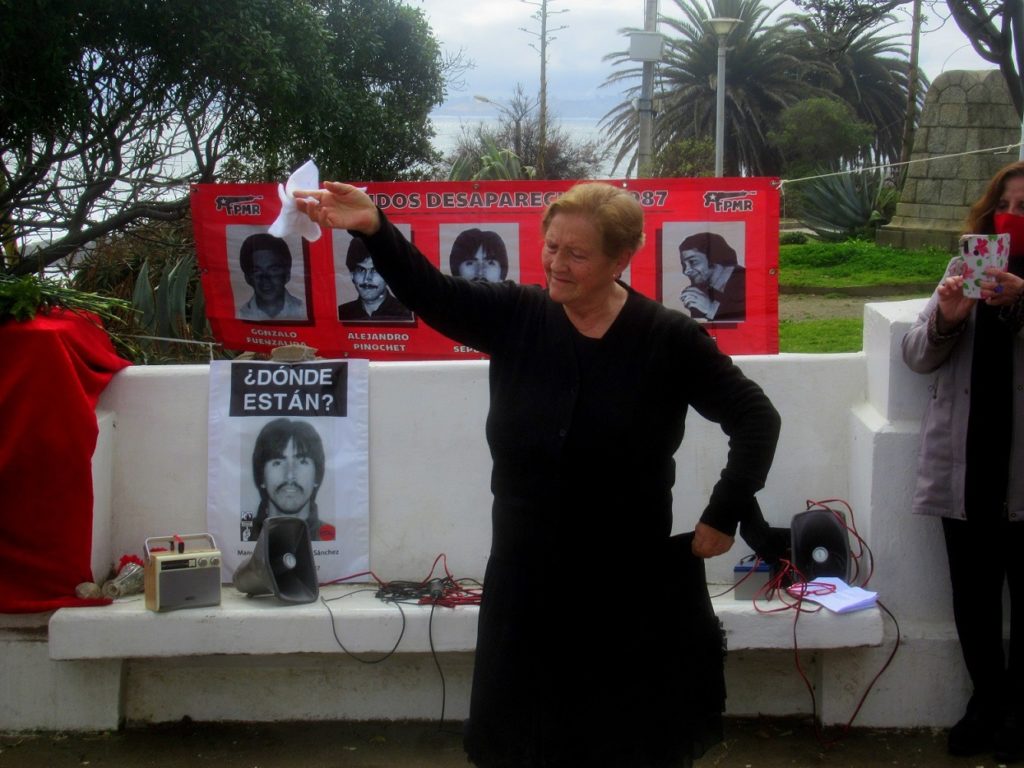 Esta ceremonia se llevó a efecto hoy a mediodía en la “Plaza de Los Loros”, ubicada a un costado de la Facultad de Odontología, por debajo de un recinto de la Armada y frente a la Playa Carvallo de Valparaíso, lugar hasta donde concurrieron familiares y decenas de compañeras y compañeros, quienes dieron vida a una emotivo acto político cultural que se inició con el impactante baile de la cueca sola realizado por Olga Jeria, hermana de un Detenido Desaparecido, coreografía que fue creada por la Agrupación de Familiares de Detenidas y Detenidos Desaparecidos (AFDD) precisamente para simbolizar la ausencia de los seres queridos.