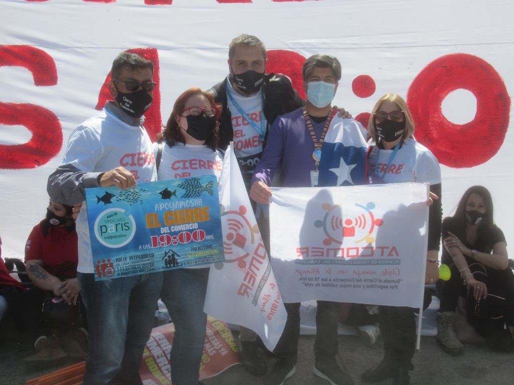 “Lucía Pantoja, alianza Atcomer (Alianza de Trabajadores del Comercio) y estamos luchando acá para el cierre del comercio a las 19 horas; Fenacenco (Federación Nacional Alianza Cencosud), cierre del comercio a las 19 horas.”