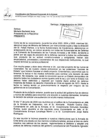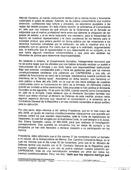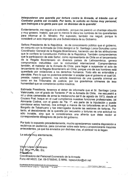Fue entonces cuando Víctor López recibió una llamado de la entonces subsecretaria Marina de Michelle Bachelet, Carolina Echeverría. Esta lo presiona para que, a cambio de la jubilación, los marinos antigolpistas retiren la querella por torturas contra la Armada. La directiva de la Asociación de marinos convoca una conferencia de prensa para denunciar las presiones de la subsecretaria. Clarín fue el único órgano de prensa que cubrió la noticia y publicó la carta firmada por Víctor López (más abajo).