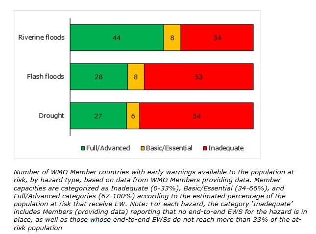 - Los sistemas de pronóstico y alerta de inundaciones fluviales de extremo a extremo están ausentes o son inadecuados en el 34% de los que proporcionaron datos;
