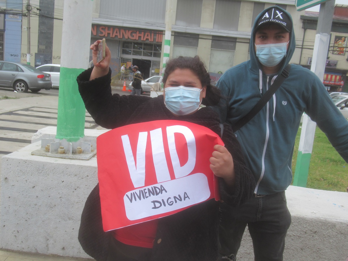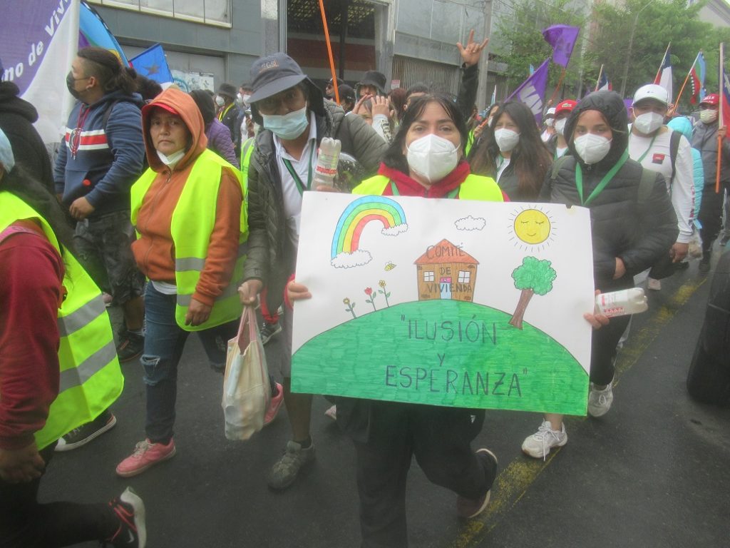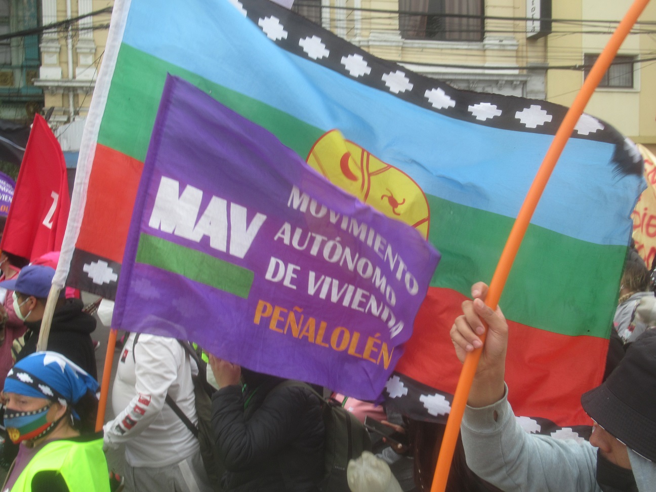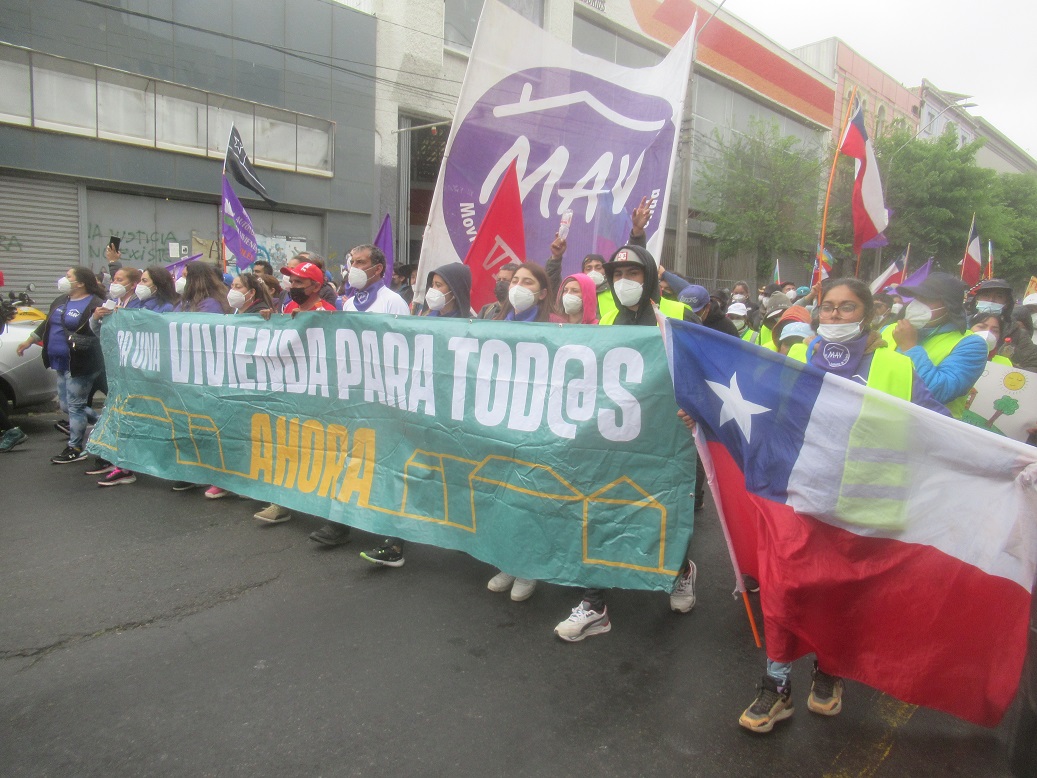 Lienzos, pancartas y consignas varias, junto a banderas chilenas, mapuche, del Movimiento Autónomo de Vivienda (MAV) y del Movimiento Vivienda Digna (VID) flamearon al viento mientras las porteñas y porteños recibían calurosamente a las y los manifestantes en esta fría jornada primaveral, que incluso acompañó esta protesta popular con una fina y suave llovizna durante esta mañana.