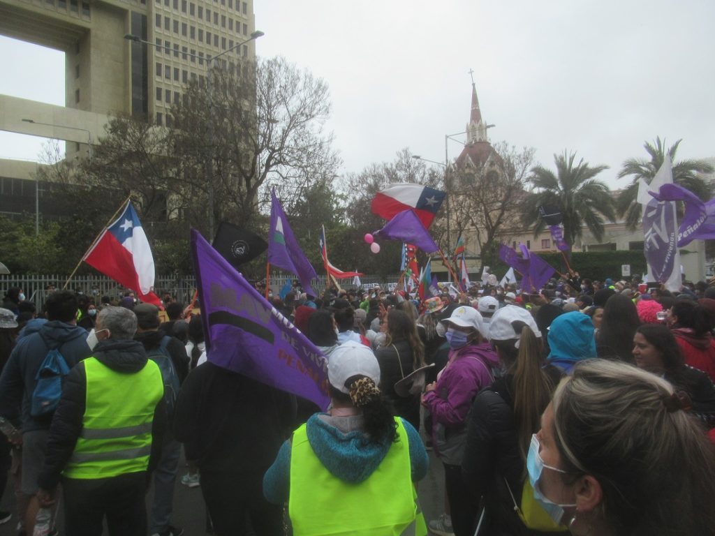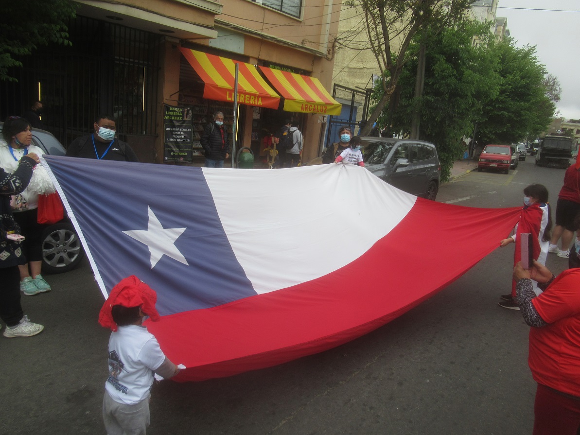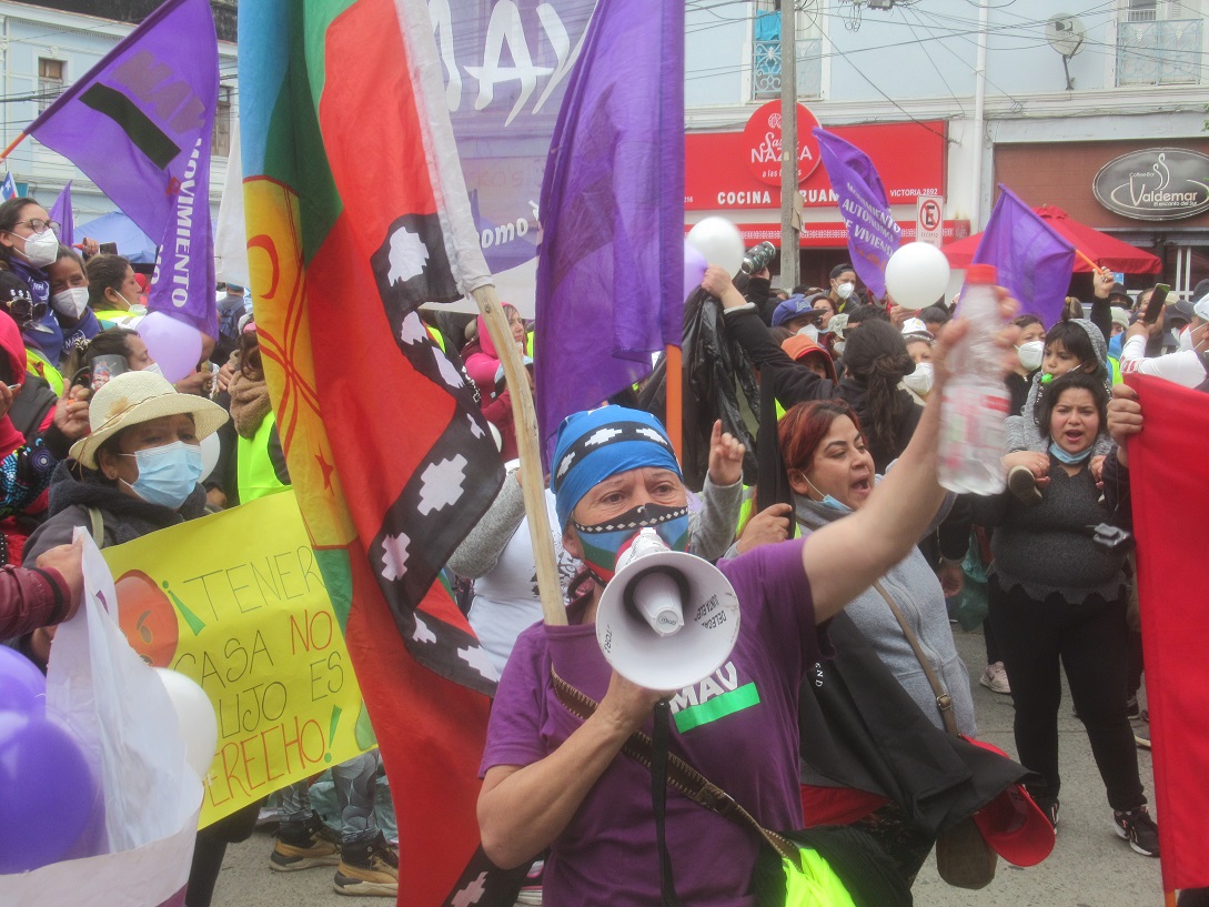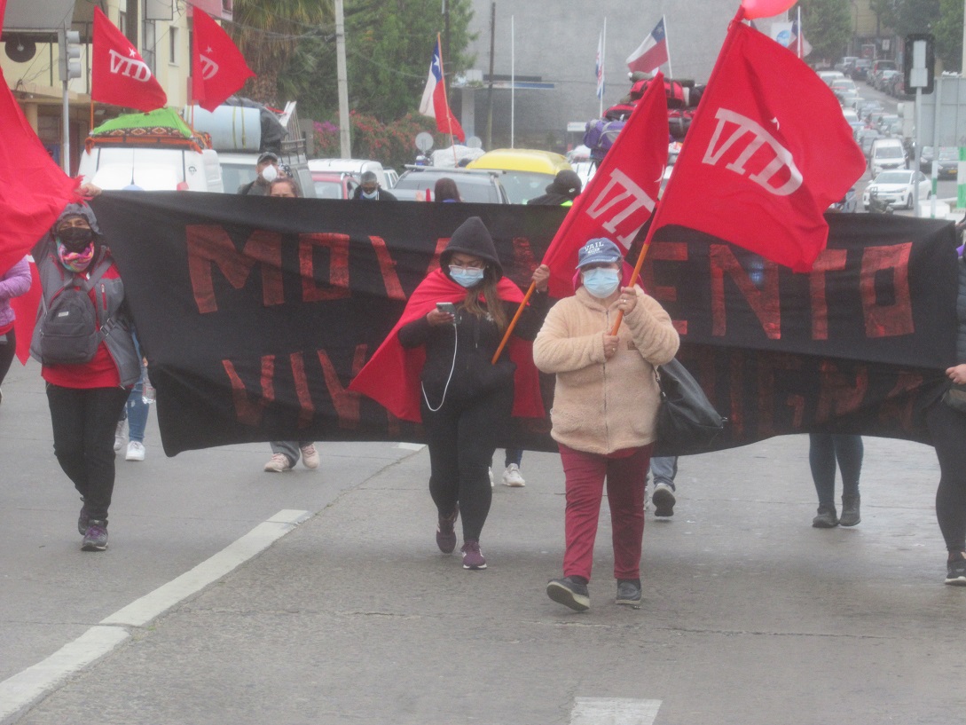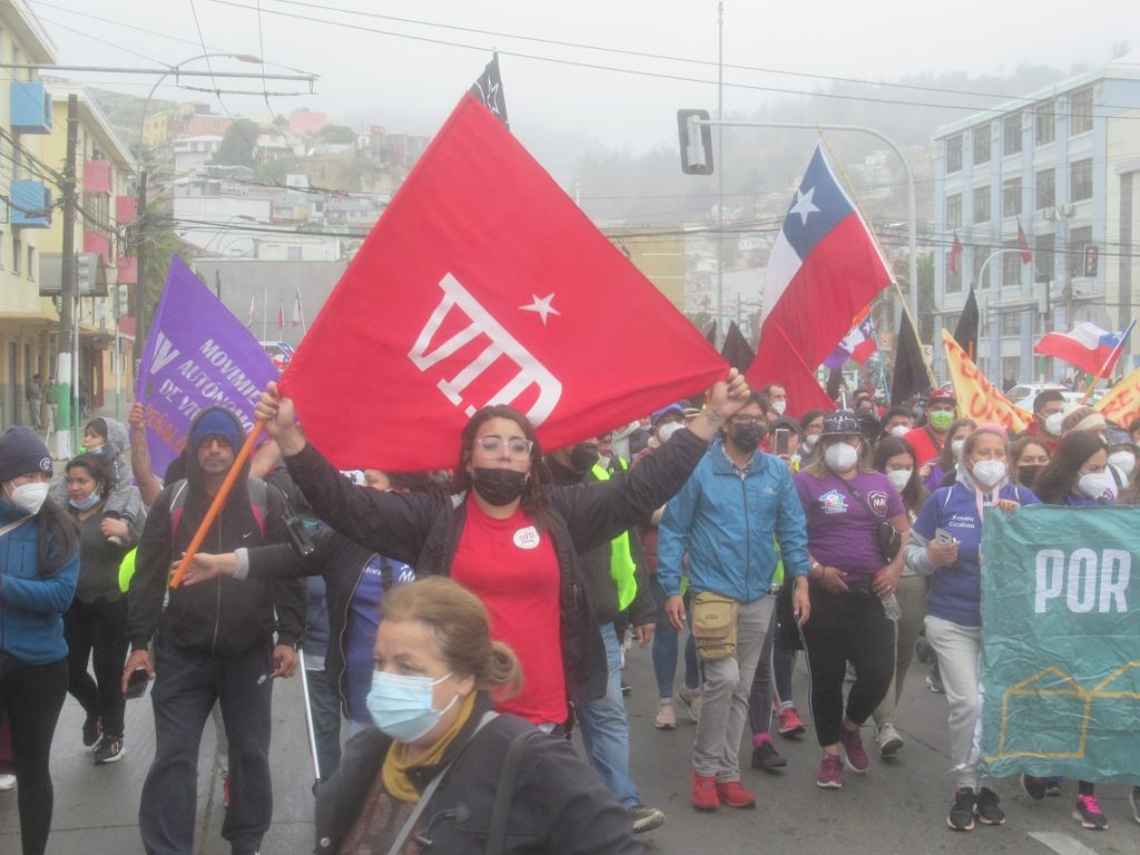 Lienzos, pancartas y consignas varias, junto a banderas chilenas, mapuche, del Movimiento Autónomo de Vivienda (MAV) y del Movimiento Vivienda Digna (VID) flamearon al viento mientras las porteñas y porteños recibían calurosamente a las y los manifestantes en esta fría jornada primaveral, que incluso acompañó esta protesta popular con una fina y suave llovizna durante esta mañana.