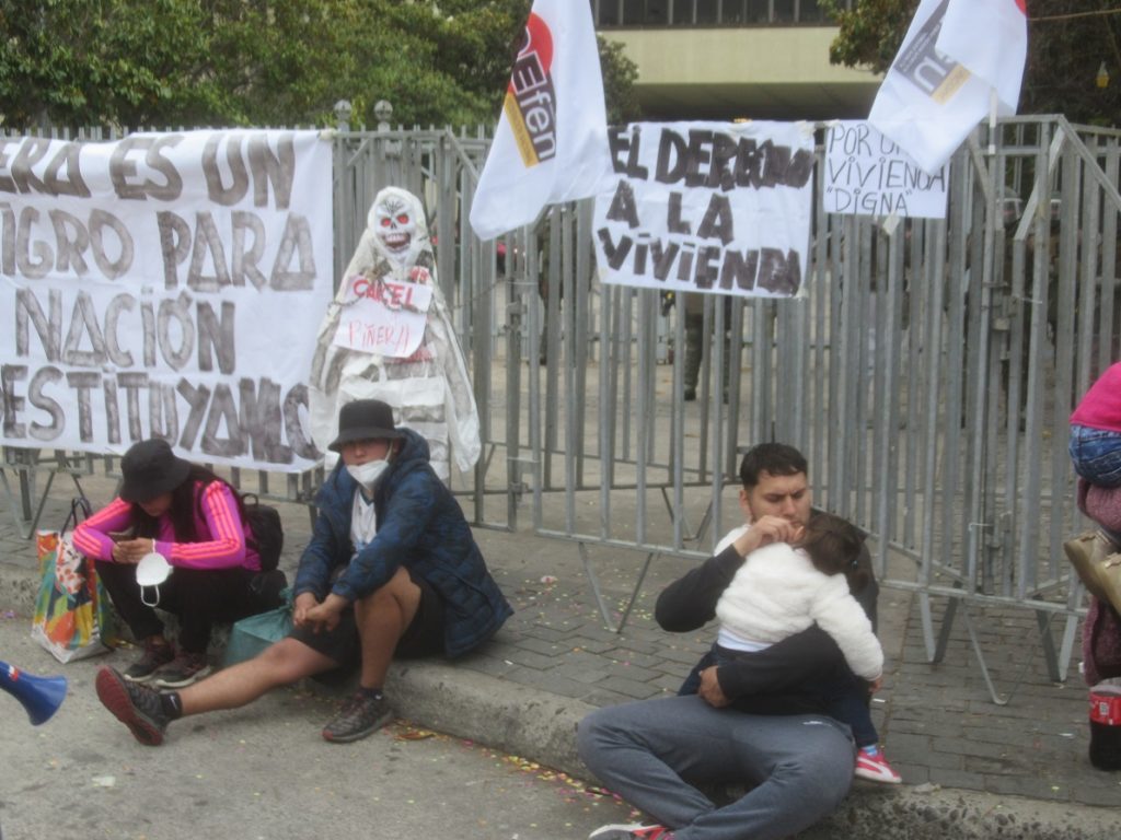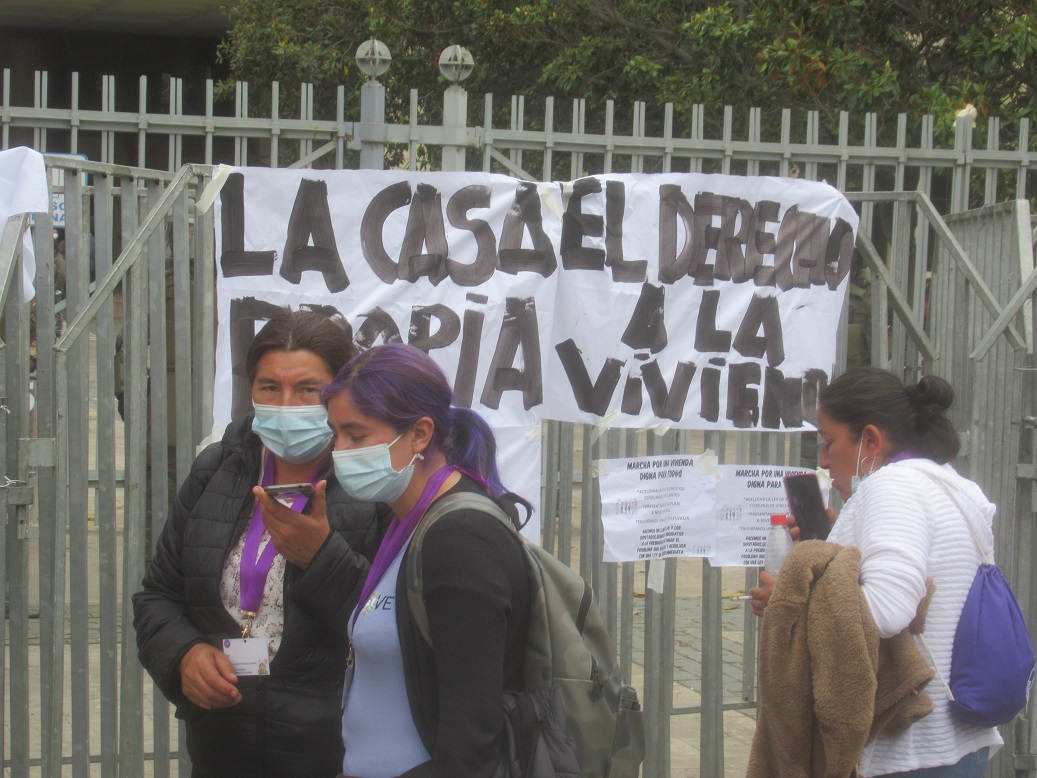 “¡Morir luchando, sin casa ni cagando!”, haciendo alusión a que seguirán adelante con su lucha por una vivienda digna, junto a la consigna “¡Sí se pudo, sí se pudo!, expresando que -pese a las dificultades y desafíos que significó que marcharan desde Santiago a Valparaíso por la ruta 68 incluso familias completas junto a sus pequeños hijos e hijas- habían logrado el objetivo de desplazarse a pie desde la comuna de Peñalolén hasta las puertas mismas del Congreso Nacional para manifestar y exigir a viva voz sus demandas.