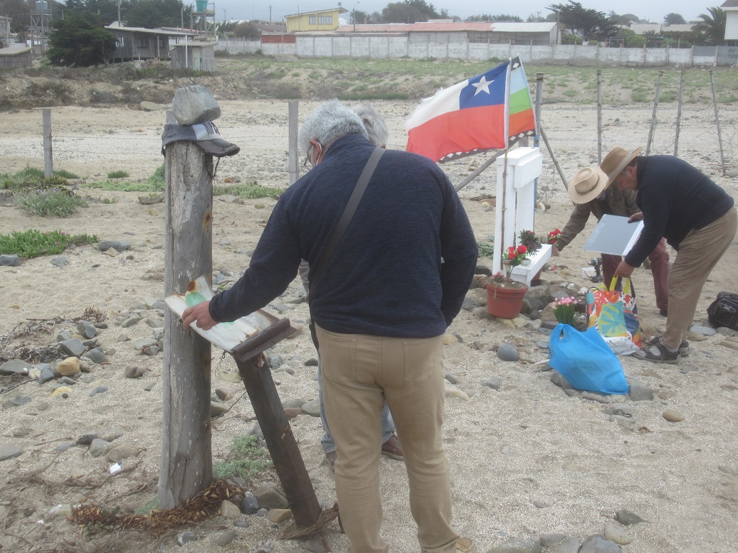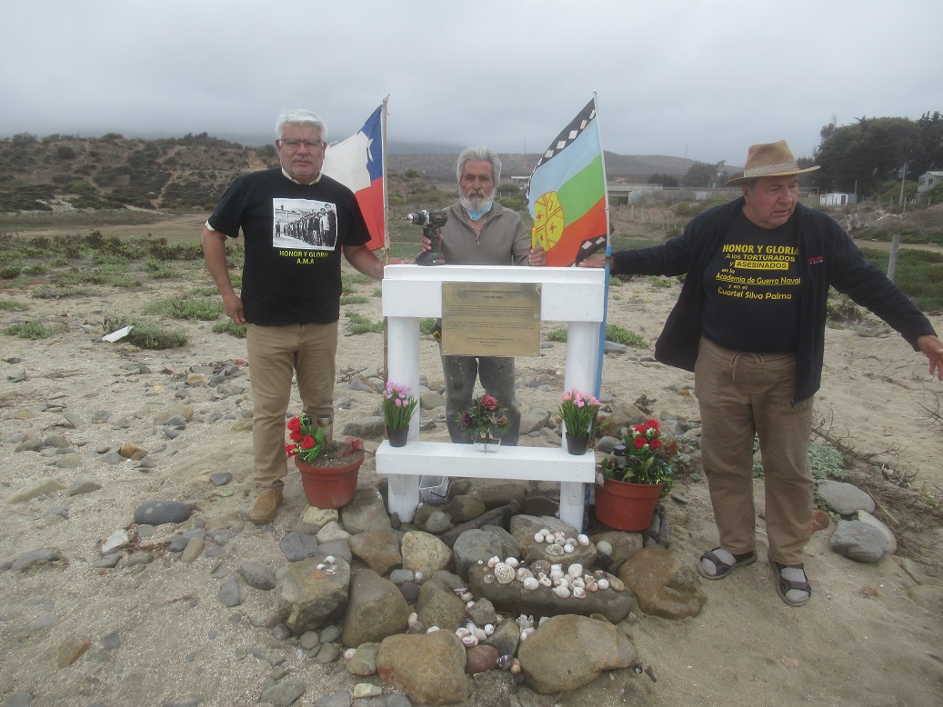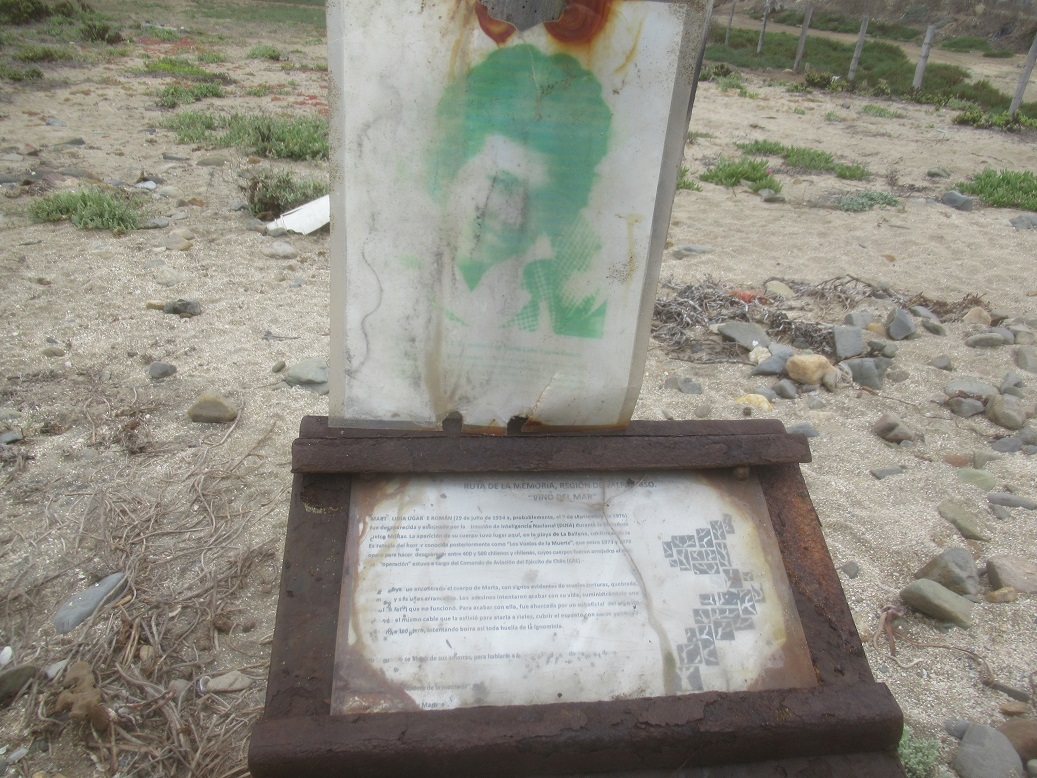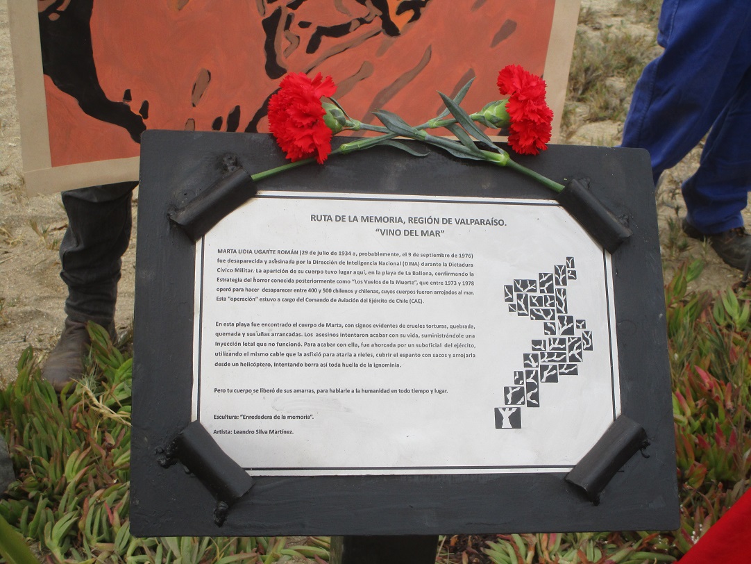 Ayer miércoles 10 de noviembre del 2021 un grupo de compañeros participó de la instalación de este pequeño monumento formado por una estructura de madera cubierta de pintura marina de color blanco sobre la cual se instaló una placa dorada de acrílico en la que está escrito: “Ruta de la memoria región de Valparaíso. Vino del Mar. Este memorial es recuerdo imperecedero de vidas, dignidades, cuerpos, familias y sueños. También huella latente de desapariciones, muertes y torturas sistemáticas. En estas costas apareció el cuerpo de la profesora Marta Lidia Ugarte Román, que escapando de las amarras de sus torturadores emergió el 09 de septiembre de 1976 en La Ballena como mudo testimonio de la brutalidad de la dictadura cívico-militar y de los Vuelos de la Muerte. No fue un crimen pasional como la prensa cómplice quiso encubrir. Fue el cuerpo de una mujer lanzado desde un helicóptero militar para hacerla desaparecer para siempre, aunque el mar la trajo de vuelta y la arena la abrazó. No pudieron contigo Marta, como no podrán con todos nosotros y nosotras. Aquí en estas hermosas costas y al lado de la primera planta comunal desalinizadora de agua de mar de Chile que lleva tu nombre “Marta Lidia Ugarte Román”, te recordaremos como mujer, hija, hermana, compañera y amiga. Así, todo ser humano noble que visite La Ballena, comuna de La Ligua, te recordará al mirar el horizonte que se dibuja en el mar.” La placa termina con la siguiente leyenda para expresar que este nuevo memorial corresponde a un “Esfuerzo colectivo de voluntades solidarias anónimas. Restauración de Memorial. Noviembre 2021.”