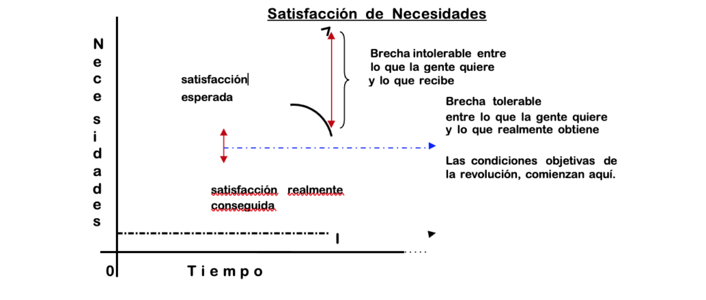 La moderna teoría de la revolución señala que una sociedad cae en un proceso revolucionario agudo y catastrófico cuando se dan las necesarias condiciones objetivas y subjetivas. Las condiciones objetivas indican que la sociedad afectada por el proceso revolucionario debe primero experimentar un largo y provechoso periodo de progreso y de desarrollo económico acelerado, y este proceso dura varias décadas. No obstante, este periodo de crecimiento acelerado de repente se interrumpe abruptamente y la sociedad afectada cae en una aguda y profunda crisis económica. En esta catástrofe el producto bruto cae precipitadamente y las masas populares caen en la pobreza y ella dura varios años. La brecha o abismo entre lo esperado y lo verdaderamente recibido, para la inmensa mayoría de la población, se expande y crece con cada año de crisis económica. Así llega a un momento crucial donde esta brecha se hace intolerable y es ahí donde explota una catastrófica revolución. Para mayores detalles sobre la teoría de la revolución sírvase ver el documento adjunto titulado “La Crisis de la Civilización Occidental y la Teoría de la Revolución”, publicado por El Clarín de Chile en el año 2017.