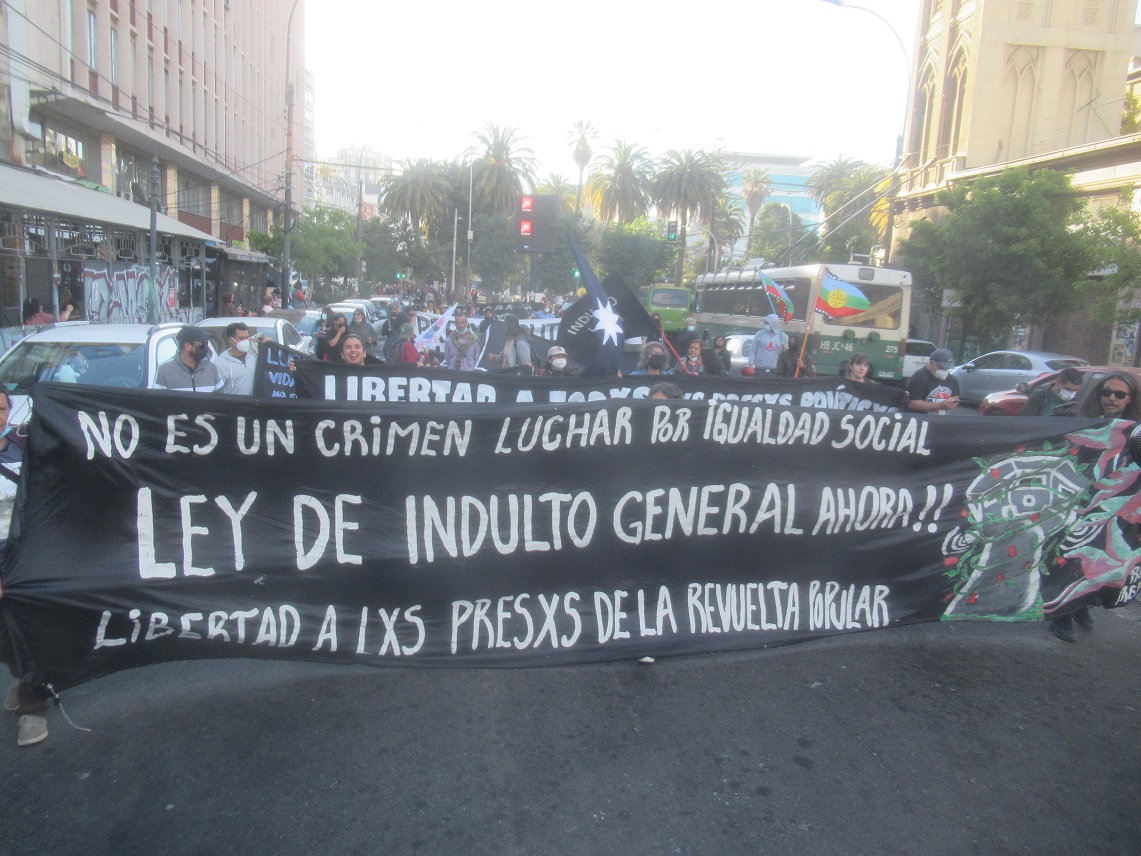 Por otro lado, ayer jueves 18 de noviembre, a las seis y media de la tarde, un grupo de manifestantes y familiares de presos políticos de la revuelta se congregaron en la Plaza Victoria de Valparaíso para marchar desde allí hasta el Congreso Nacional, exigiendo la libertad de todos los presos y presas políticas, demandando que se apruebe a la brevedad una Ley de Indulto general.