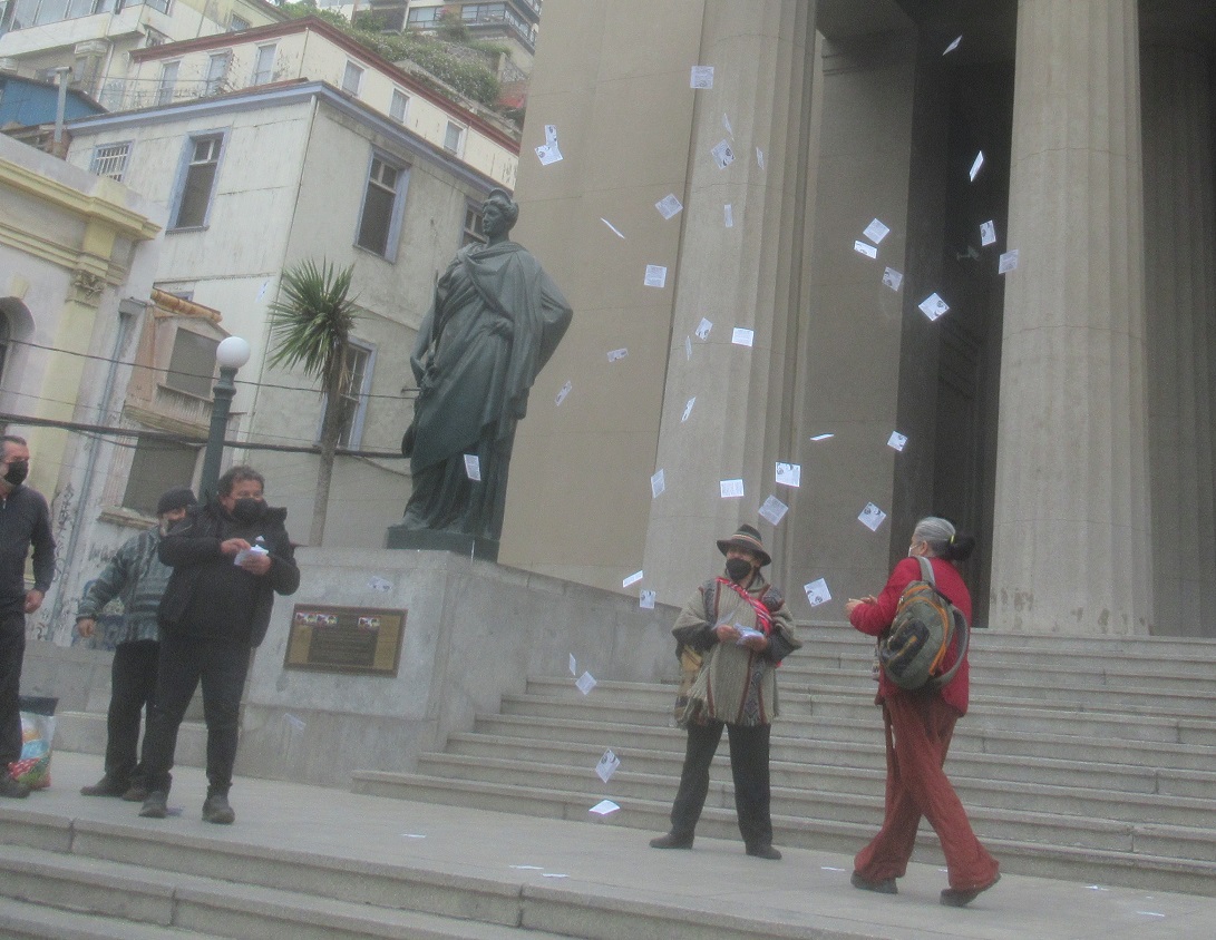 El grupo de manifestantes, luego de permanecer algunos minutos en este lugar expresando a viva voz sus demandas, lanzando panfletos al aire y voceando consigna tales como: “¡Poder Judicial, vergüenza nacional, protege a criminales de lesa humanidad! Y “¡La Armada chilena debe responder, matar a los chilenos no era su deber!”, realizaron una marcha por las calles céntricas de Valparaíso, desplazándose desde los Tribunales hasta la plaza Aníbal Pinto, sector donde una vez más hicieron uso de la palabra para explicar el motivo de esta movilización a las porteñas y porteños, dando así por finalizada esta movilización.