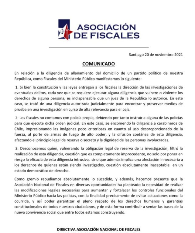 La Asociación de Fiscales repudió el operativo policial ejecutado por el GOPE de Carabineros que culminó con el allanamiento de la sede del partido Comunes a raíz de la indagatoria judicial contra la candidata Karina Oliva. En comunicado público, el organismo critica la acción de carabineros en cuanto al «uso desproporcionado de la fuerza, el porte de armas de fuego de alto poder y la difusión coetánea afectando el principio legal de reserva o secreto y la dignidad de las personas involucradas»