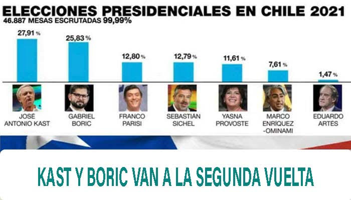 El 19 de diciembre competirán, por un lado, el ultraderechista José Antonio Kast, del nuevo referente ultraderechista, Frente Social Cristiano. Él obtuvo 27,91% de acuerdo al último cómputo del Servel. Por otro, Gabriel Boric, candidato del emergente bloque de izquierda Apruebo Dignidad, que obtuvo 25,83% de preferencias.