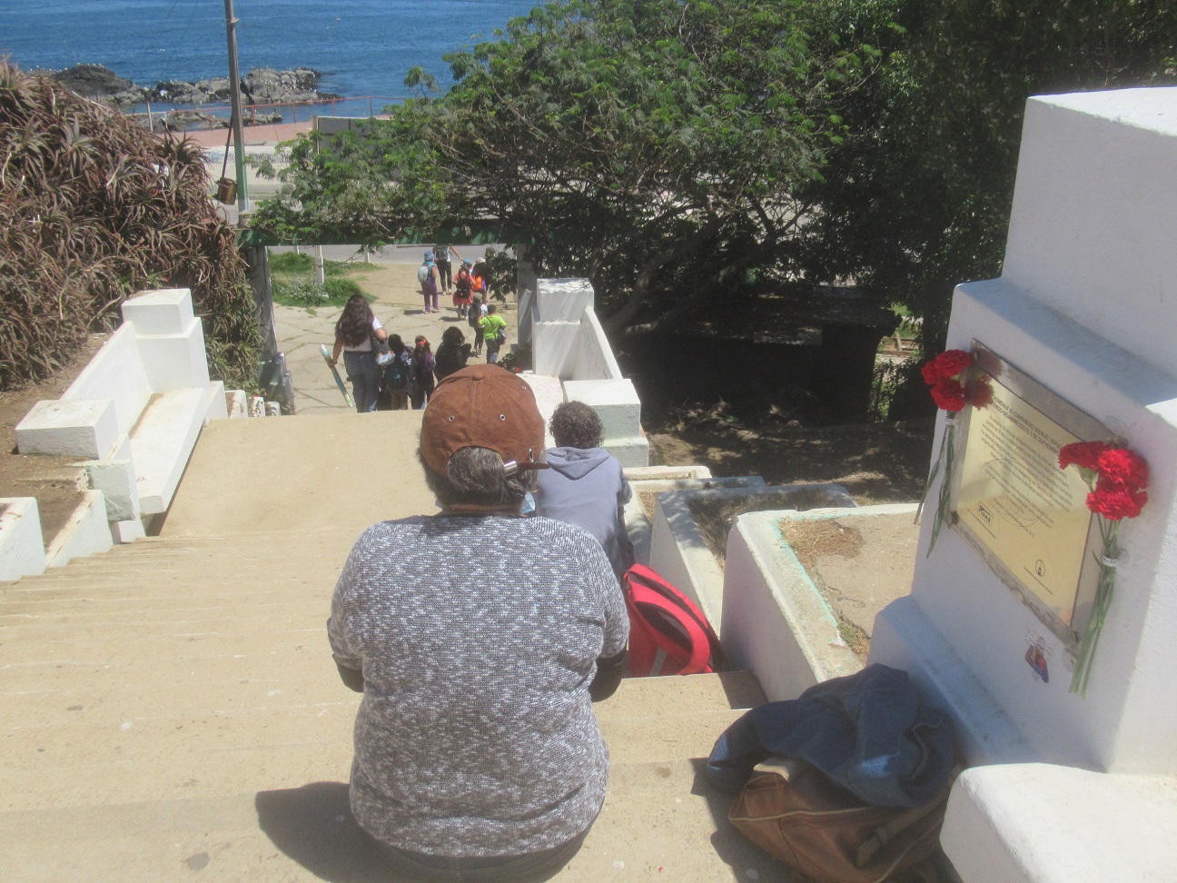 En medio de la conversación llegó Sebastián, el hijo de Manuel y Verónica, quien luego de saludarnos se sentó un poco más abajo de donde nos encontrábamos y permaneció en silencio hasta que finalizamos esta íntima y emotiva conversación. Un bullicio proveniente de un grupo de niñas y niños llenó de pronto el espacio en donde se ubica la Placa de Memoria en recuerdo y homenaje a Manuel Sepúlveda, observándonos con sus miradas curiosas mientras pasaban por nuestro lado descendiendo por la escalera rumbo a la playa Carvallo.