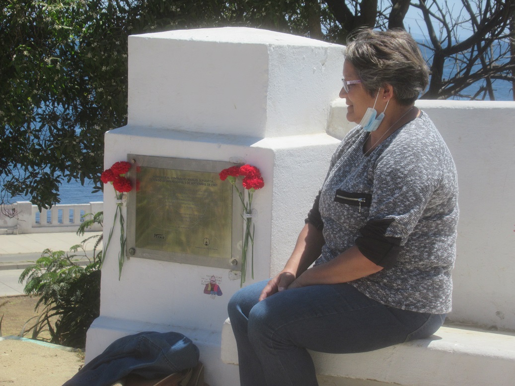 Hoy jueves 25 de noviembre acordamos encontrarnos para conversar de lo que ha significado para ella la existencia de este Memorial ubicado en Playa Ancha. Cuando voy llegando al lugar, a la distancia la observo limpiar con un paño la plaquita de Manuel como si se tratara de un delicado y preciado cristal; de pronto percibe mi presencia, se gira hacia mí, nos saludamos y me acerco a conversar, como habíamos acordado.