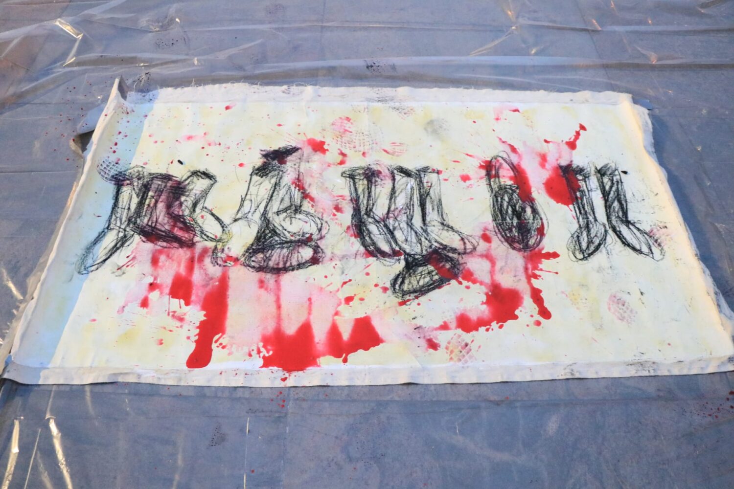 “FALSOS-O-PUESTOS es una acción de dibujo de unas botas que nos habla de la representación de las 6402 personas que con propuestas de trabajo y en otras ocasiones reclutadas ilegalmente fueron asesinadas por el ejército nacional de Colombia y presentadas después como guerrilleros abatidos en combate para así mostrar al mundo que el conflicto armado se estaba ganando. Cabe resaltar que en esta macabra acción vestían a las víctimas de guerrilleros y en muchos de los casos les colocaron las botas al revés” explica Jhoseth Silva. “Es por eso que las botas han pasado a ser un icono contextualizado, de esta herida abierta que tiene Colombia”.