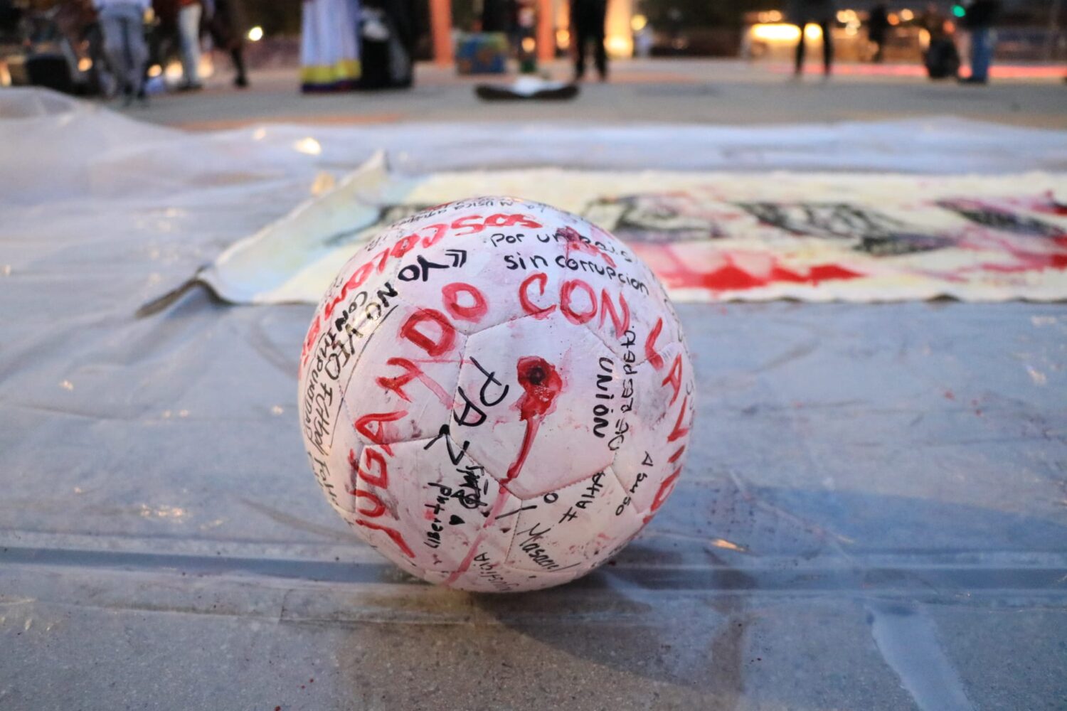 “JUGANDO CON LAS VIDAS es un performance que nace de la experiencia que tuve durante la mayor parte de mi juventud como futbolista y el acople que hago ahora como artista, para así generar una idea – un retrato – que denuncia los comportamientos censurables de gobiernos como el de Colombia”, sigue Jhoseth. “En este performance, hago dominio con un balón que está cubierto de pintura roja y tiene escrito palabras alusivas a lo que persiste en Colombia, en donde la corrupción, la utilización de armas contra el pueblo, la muerte de jóvenes en las protestas, el abuso policial y las masacres en general; son un nefasto diario vivir”.