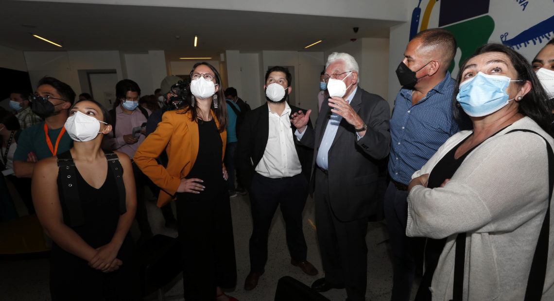 Este martes el Presidente Electo, Gabriel Boric, la Alcaldesa de Santiago, Irací Hassler, el Director Ejecutivo del Centro Cultural Gabriela Mistral (GAM), Felipe Mella y el Premio Nacional de Arquitectura, Miguel Lawner, recorrieron las instalaciones del GAM, donde conversaron sobre la memoria y la historia de este importante recinto cultural.