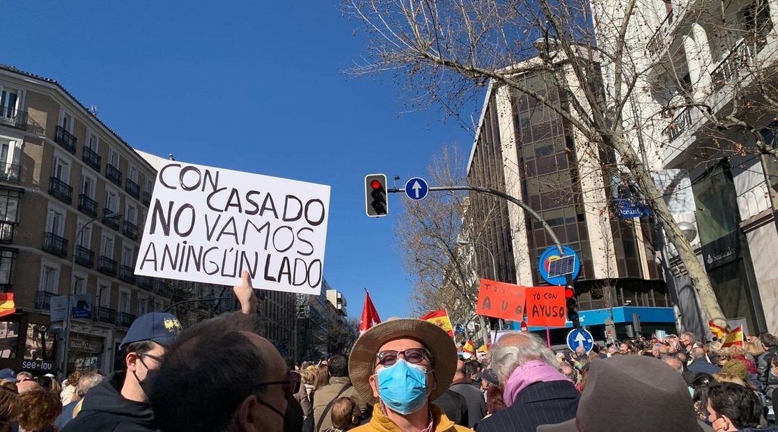 Al grito de “Casado, dimisión” y “Ayuso, presidenta”, alrededor de cinco mil personas se manifestaron frente a la sede del derechista Partido Popular (PP) para exigir la dimisión de la actual cúpula directiva. La mayoría de los manifestantes eran militantes o simpatizantes de la formación política conservadora, que es además el principal partido de oposición de España, que vive sumido en una crisis sin precedentes desde el pasado martes y que todo apunta a que tendrá consecuencias imprevisibles.