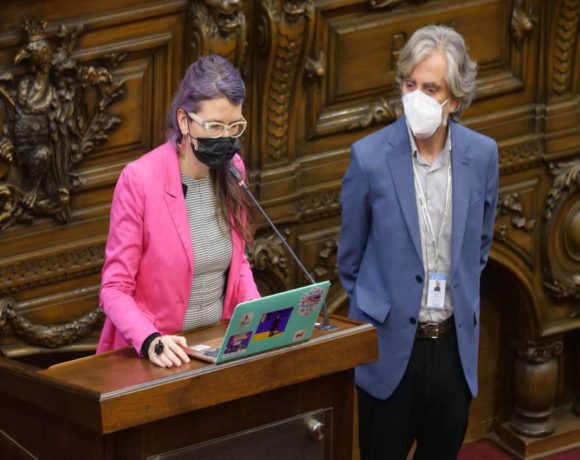 Bertha Lucia Fries, víctima de los atentados en El Nogal, 7 de febrero de 2003, por las FARC, acompaña a Rodrigo Londoño en este viaje del otro lado del océano, como también supo hacerlo durante la firma de los Acuerdos de Paz en La Habana en 2016 o enseñando el proceso de transición a otra vida a los combatientes que vivían en los campamentos. Eso, a pesar de haberse quedado 8 años tetrapléjica por causa del atentado de las FARC al Club El Nogal.