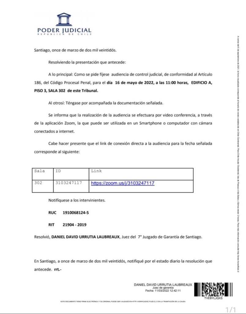 La audiencia se realizará vía zoom el 16 de mayo de 2022, a las 11 horas, edificio A, piso 3, sala 302 del citado tribunal.