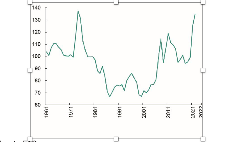 Figura 4.3. El índice de precios de alimentos de la FAO, enero de 1961 a febrero de 2022 (Índice de precio real, periodo de referencia: 2014–2016)