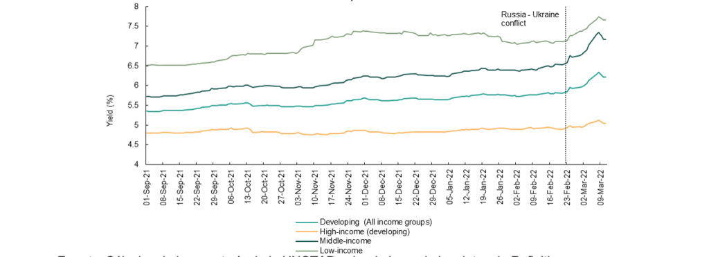 Nota: Datos de 524 bonos soberanos emitidos por 68 países clasificados como países en desarrollo por la UNCTAD. Los bonos cubiertos están denominados en dólares o en euros y bajo la ley de Nueva York e Inglaterra con vencimientos fijados después del 01/03/22. El rendimiento medio se estima como la media simple de los bonos por país (a nivel de país) y grupos de renta (rendimiento por país).