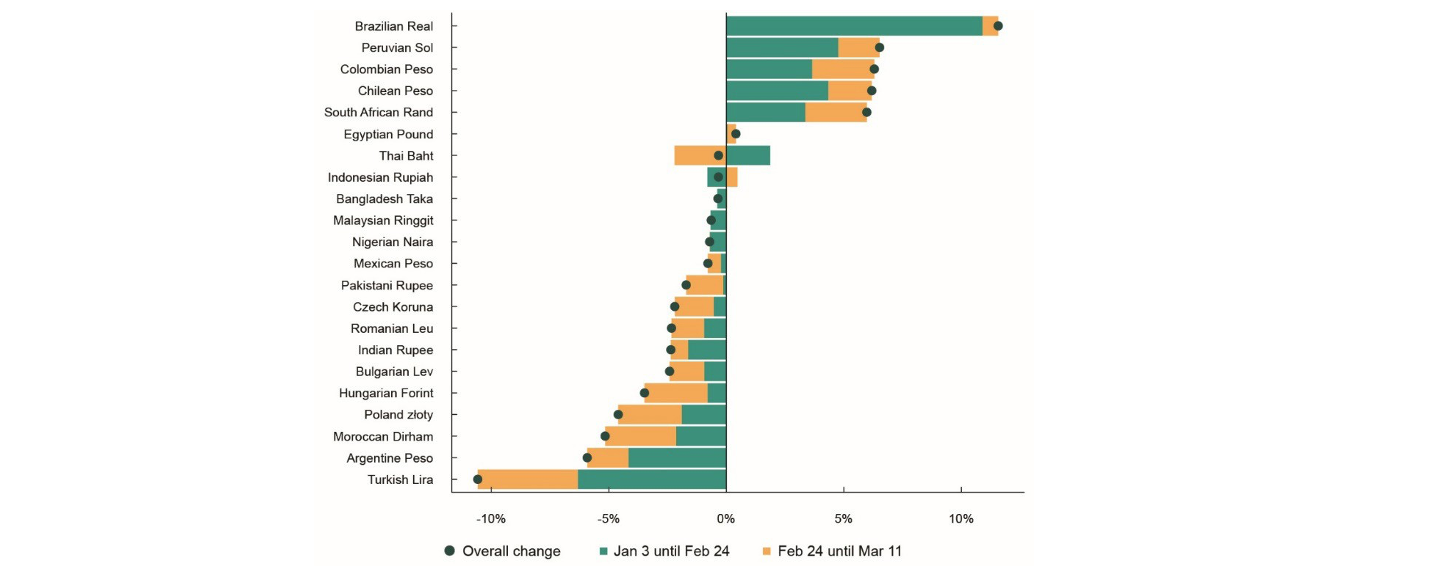 Nota: Número positivo supone apreciación. Los cálculos usan los tipos de cambio diarios al final del día. Para el tipo de cambio al 17 de marzo se toma el promedio de los valores al final del día para los tres días del 15 al 17 de marzo.