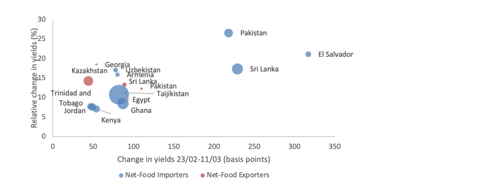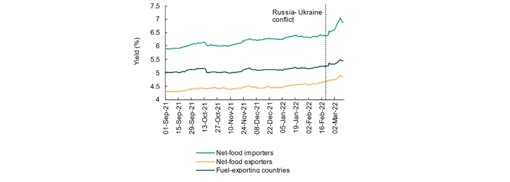 Los rendimientos de los bonos de los países en desarrollo han aumentado desde septiembre de 2021 (Figura 5.1) El aumento es generalizado y es una clara señal del endurecimiento de las condiciones financieras. Desde el estallido del conflicto en Ucrania, los rendimientos han aumentado para los países en desarrollo en otros 36 puntos básicos, por término medio, y los países que dependen en gran medida de las importaciones de alimentos han experimentado incrementos mayores (Figura 5.4).
