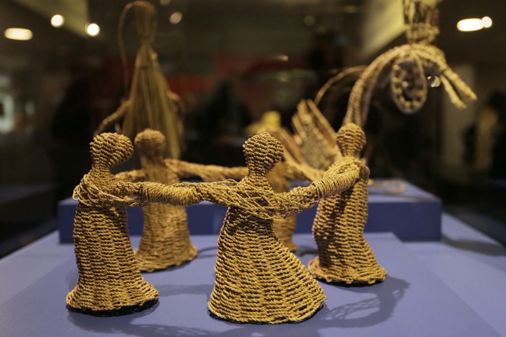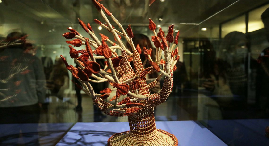 Para exponer una panorámica completa de los acervos que vinieron a completar las colecciones del museo se presentan dos muestras, que exhiben tejido y cestería, además de expresiones y materialidades estrechamente relacionadas con la tierra, como la alfarería, talla en madera, orfebrería y objetos de piedra.