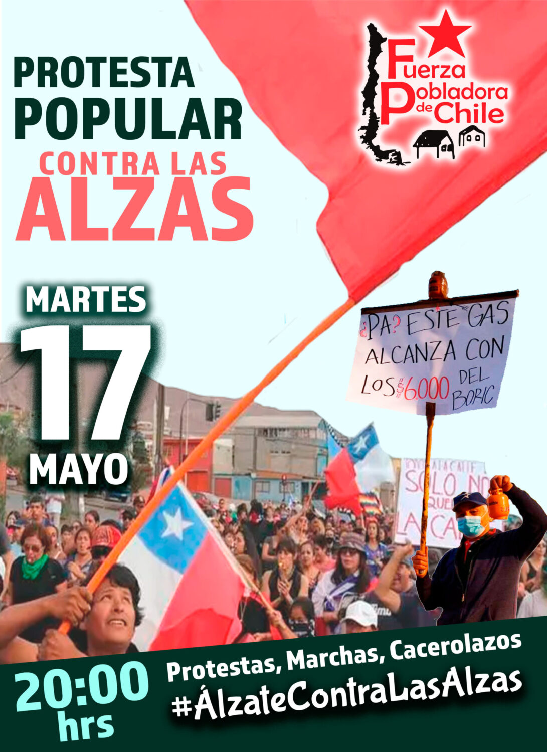 Por esta razón la Fuerza Pobladora de Chile, como organización popular que lucha por la vida digna, hace un llamado a todos los pobladores y a todo el pueblo trabajador a manifestarse en las calles como forma de denunciar y enfrentar la actual situación, y convoca para este martes 17 de mayo a las 20:00 a una Protesta Popular en todas las poblaciones del país como una forma de visibilizar nuestro descontento y manifestar con fuerza las demandas de los pobladores, contra las alzas, por las condiciones de vida de los pobladores y por una vida digna para todos.