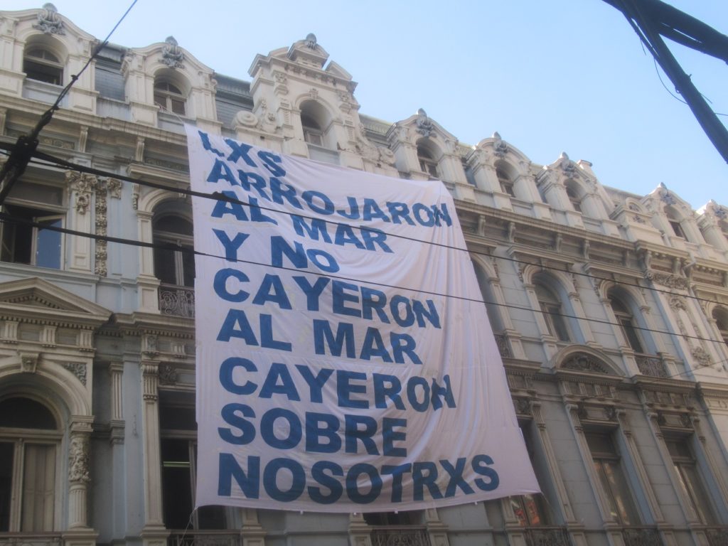 El punto de partida de este proyecto artístico de denuncia fue la instalación de este llamativo lienzo en el frontis de un edificio ubicado en la calle Esmeralda el día 21 de mayo recién pasado para que fuera visto por los miles de uniformados que desfilaron por allí durante la conmemoración de aquella fecha.