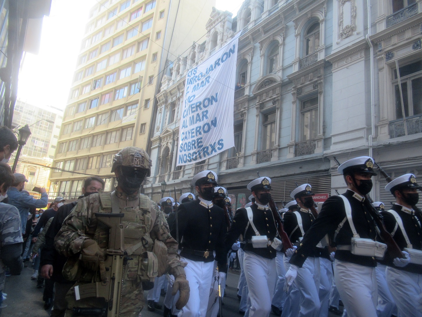 “La Armada está comprometida en la violación a los derechos humanos desde el mismo día 11 de septiembre de 1973. Se llevó a mi abuelo a Pisagua. Estoy aquí también para protestar por nuestros compañeros que siguen presos de la revuelta a manos de esta dictadura neoliberal.