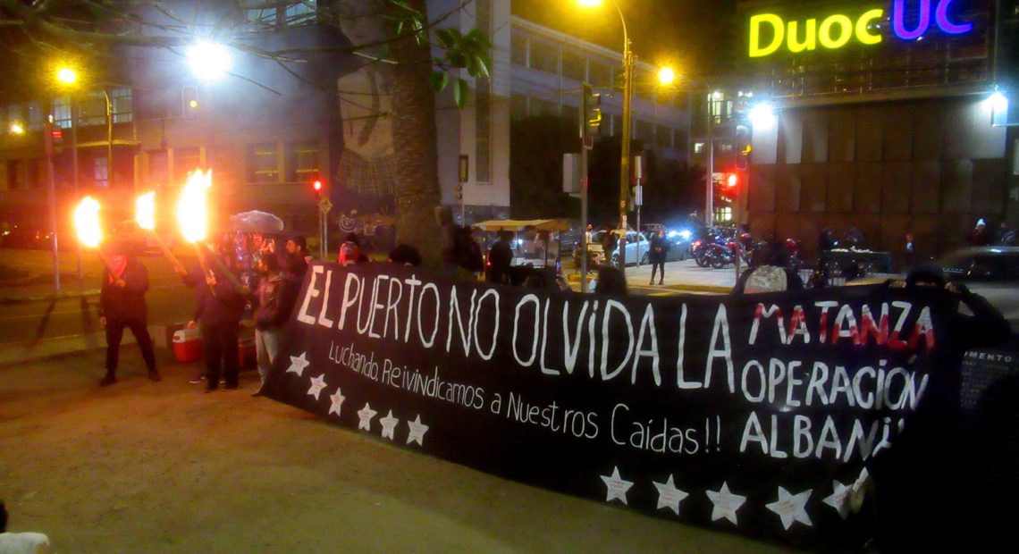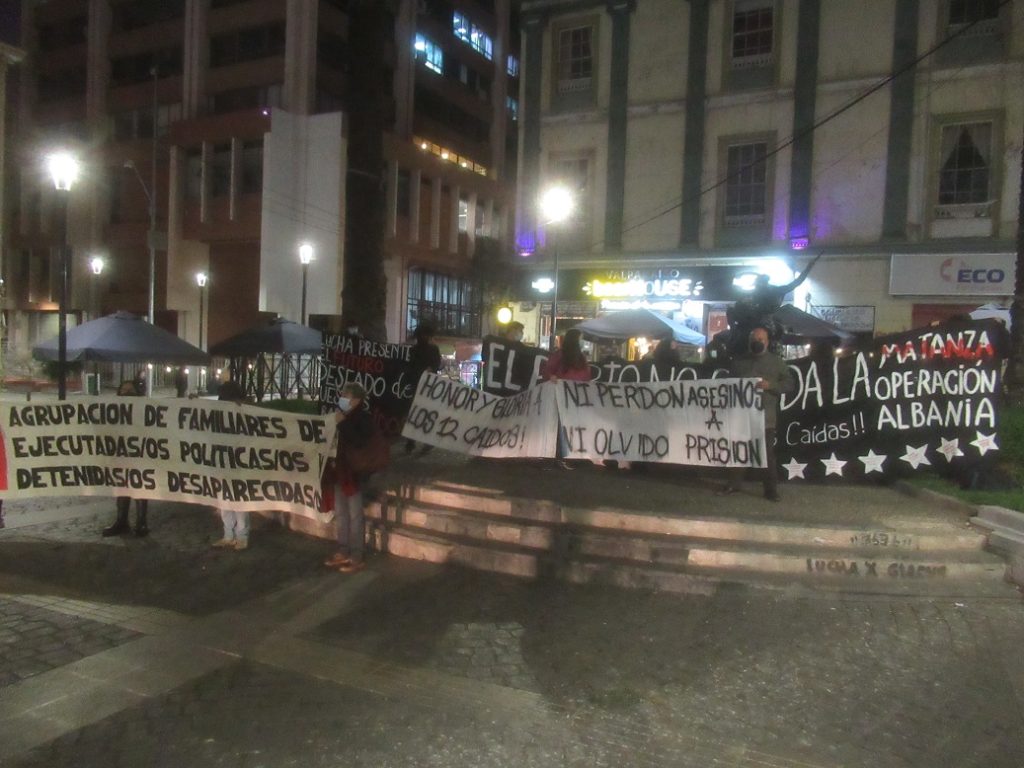 “Hoy se conmemora un año más de este triste acontecimiento, de esta brutal operación realizada por agentes del Estado de Chile donde fueron asesinados 12 compañeros. Le llamaron “Operación Albania o Matanza de Corpus Christi”. Estos jóvenes y muchachas luchaban por derrocar al tirano y aunque no lograron cumplir este objetivo hoy les recordamos y hacemos esta actividad para exigir verdad y justicia. También incluimos en esta movilización la demanda por la libertad de todos los presos políticos de la revuelta, también los presos subversivos de antes, el compañero Ramiro y los presos políticos mapuche…”
