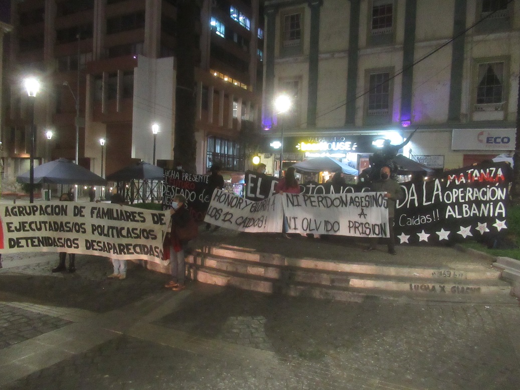 Como parte final de esta conmemoración se leyeron los nombres de las 12 compañeras y compañeros asesinados en la denominada Operación Albania seguido de un ¡PRESENTE! gritado enérgicamente por las y los manifestantes después de cada nombre: