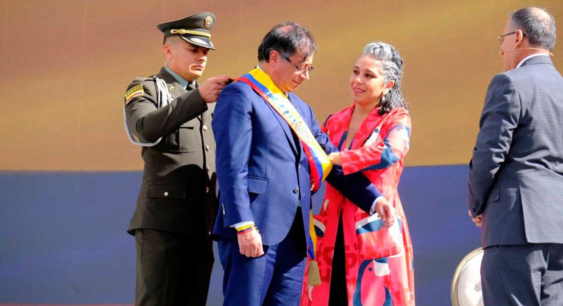 La senadora María José Pizarro, del Pacto Histórico, le colocó la banda presidencial, luego fueron lanzadas 21 salvas como parte de los protocolos de este acto.