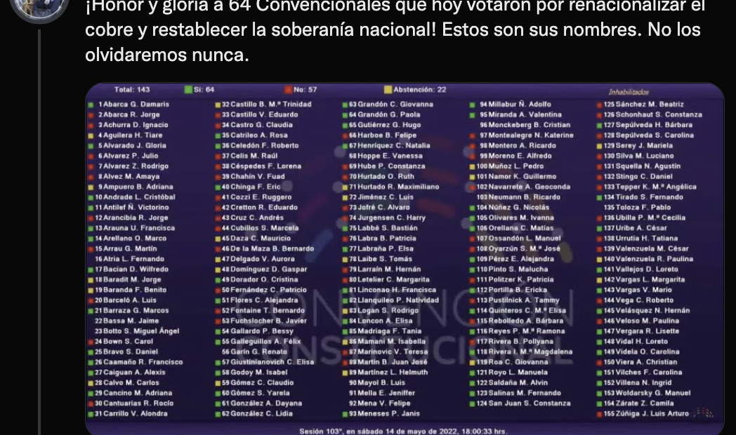¡Honor y gloria a 64 Convencionales que hoy votaron por renacionalizar el cobre y restablecer la soberanía nacional! Estos son sus nombres. No los olvidaremos nunca.