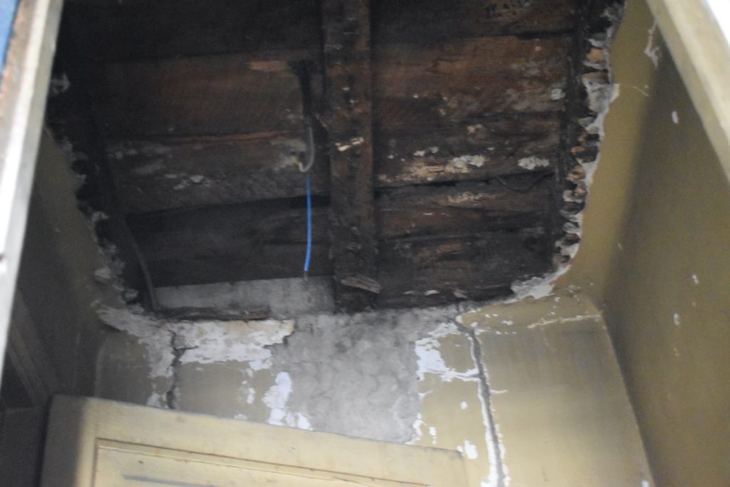 Los cimientos del Liceo, desde que se funda, tienen 109 años, y antes de eso ya existía. Entonces nunca se cambió los cimientos como tal ni la infraestructura principal. Tenemos varias cosas que tenemos que pasar a la síntesis y que tuvo que ser clausurada porque se estaba cayendo el techo. Se puede dar cuenta de todos estos cables vienen de esa misma. Varios los pasillos que se están cayendo. Tenemos salas que las puertas no cierran. Tenemos madriguera de paloma al lado de donde trabajan las manipuladoras de la comida.