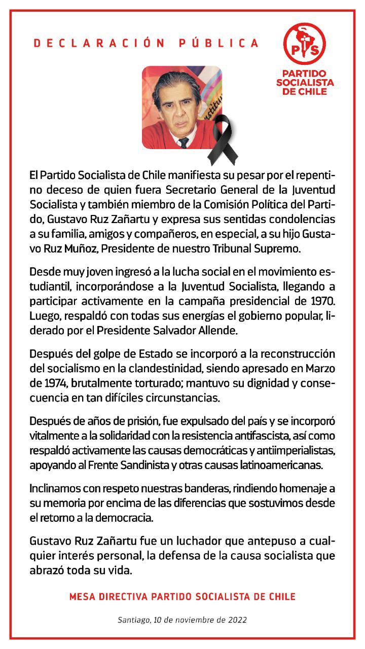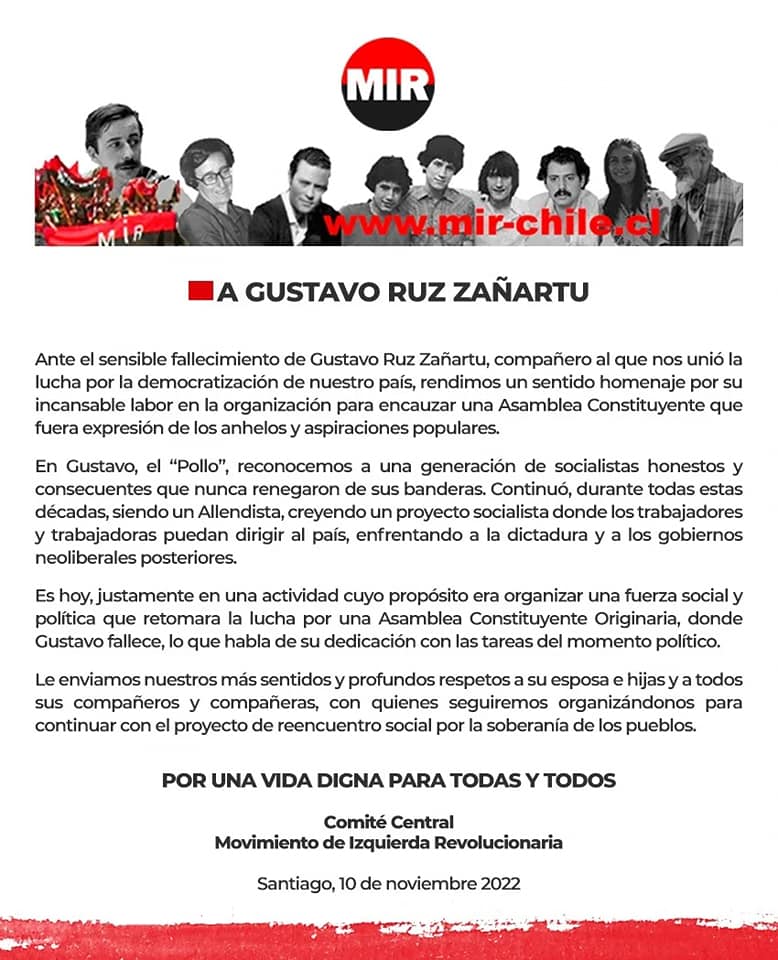 Gustavo Ruz Zañartu, histórico dirigente socialista y coordinador nacional del movimiento Asamblea Constituyente para Chile, murió ayer en Valparaíso. Su sorpresiva muerte deja un gran vacío en las organizaciones sociales y políticas por la democratización plena del país. Ruz Zañartu participó en política desde muy joven, fue asesor del presidente Allende con poco más de 20 años, estuvo preso y exiliado durante la dictadura e integró la primera dirección clandestina del Partido Socialista. Vivió en este periodo la tortura y el exilio, asumiendo a pesar de ello una activa labor en la resistencia contra la tiranía.