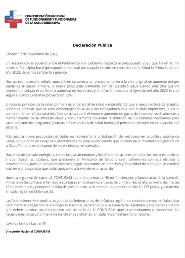 “Hacemos un llamado a nuestras bases a movilizarnos a través de un Paro Nacional el próximo martes 15 de noviembre y denunciar la falta de presupuesto, a demandar un aumento de los 10.135 pesos, y a marchar a cada región de Chile ese día”.